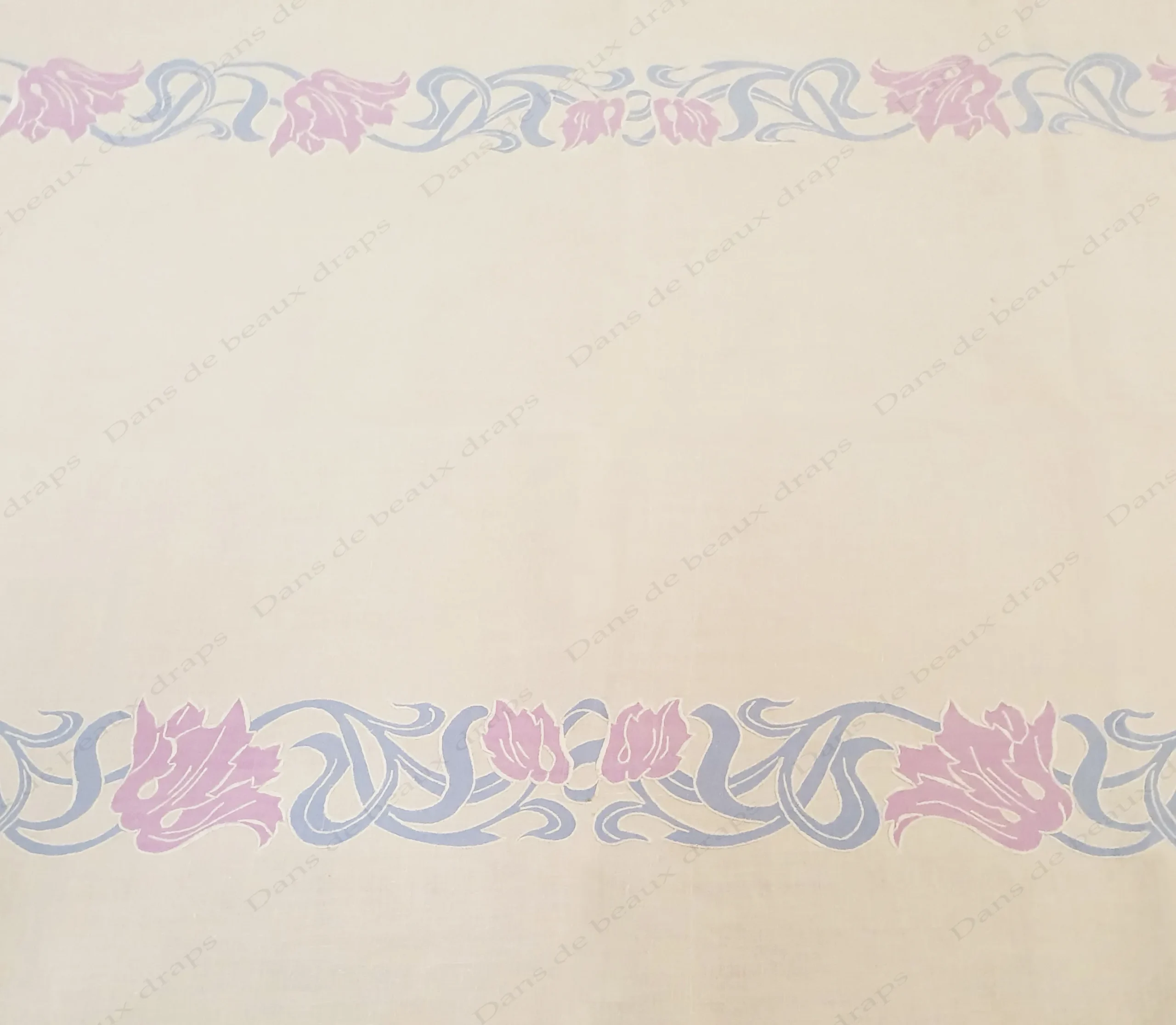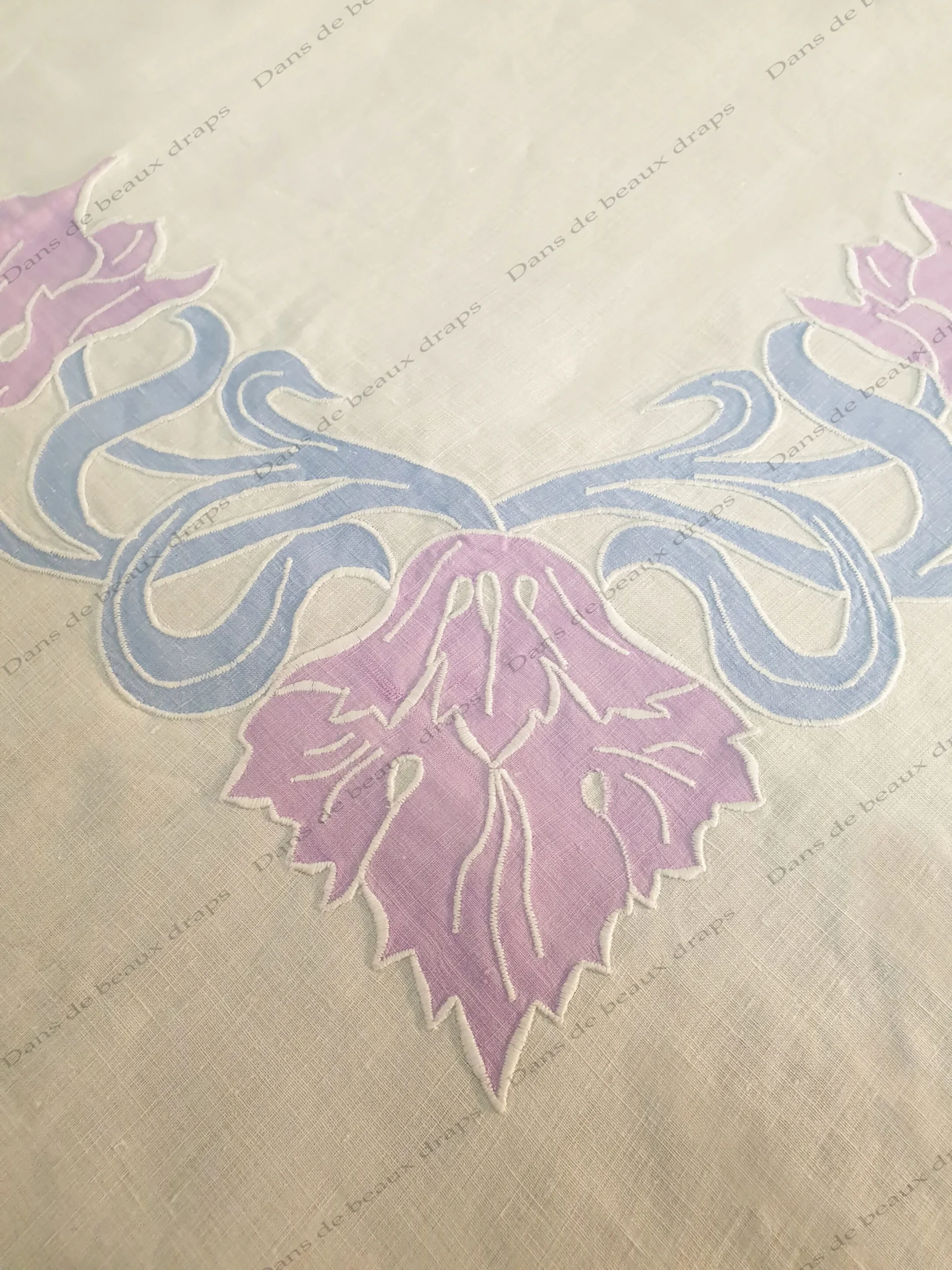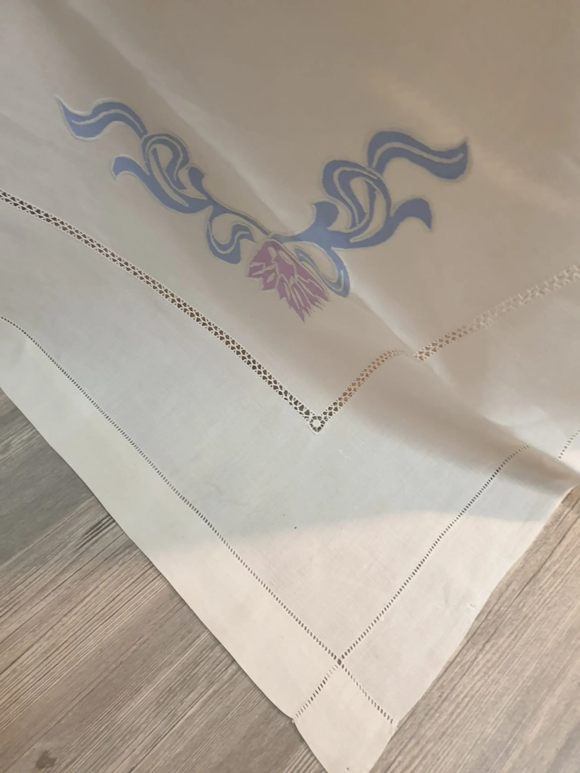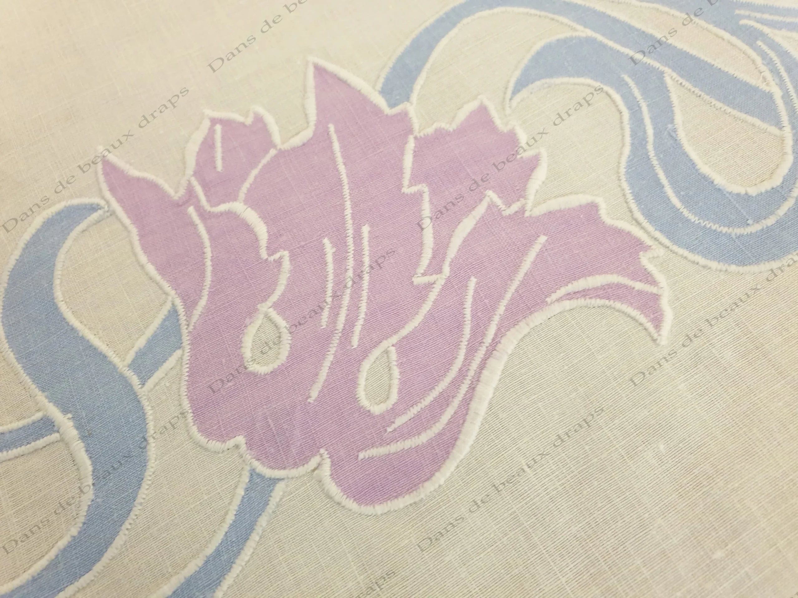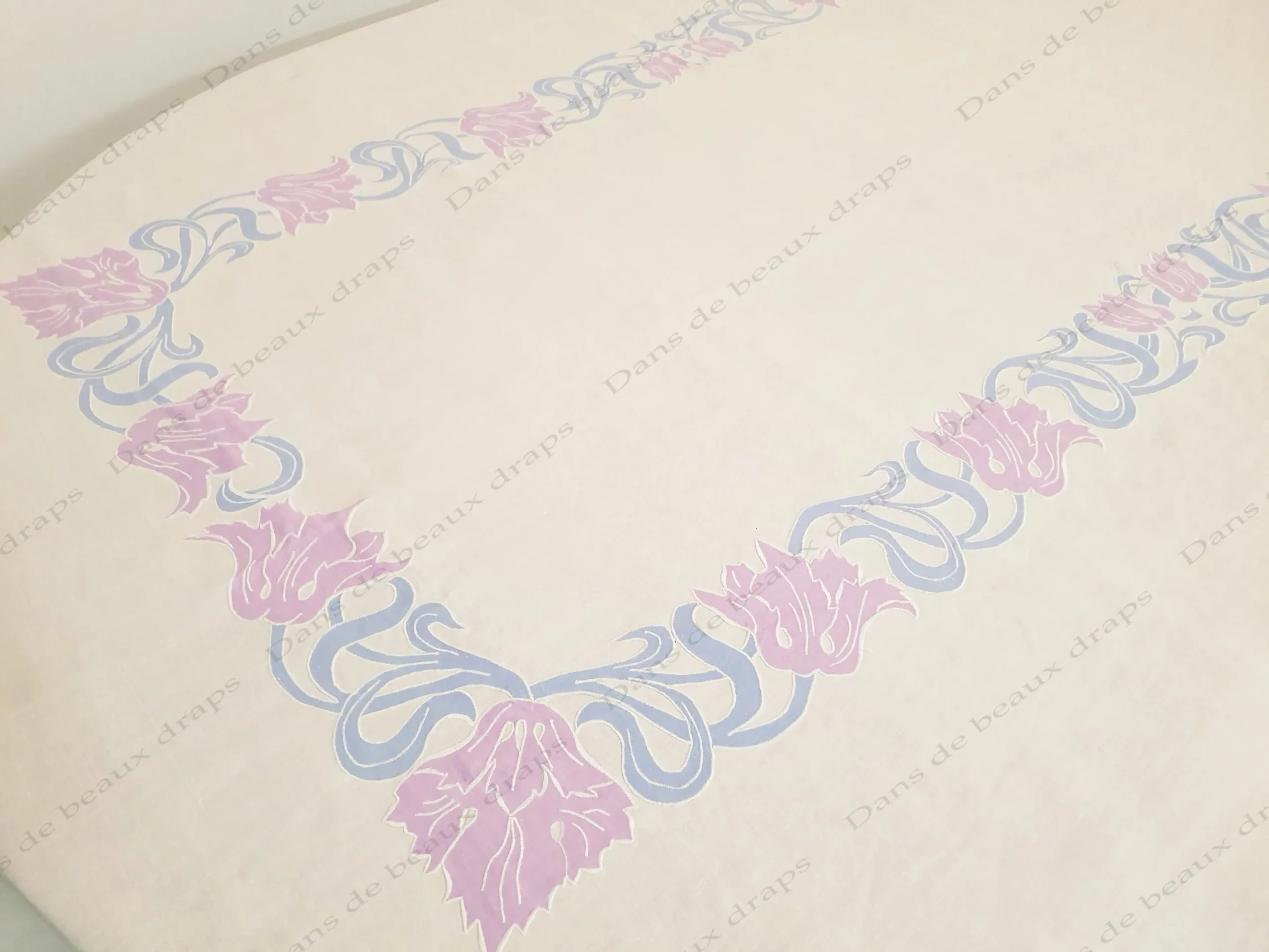 Jolie nappe en fil de lin époque Art Nouveau à décor de tulipes.