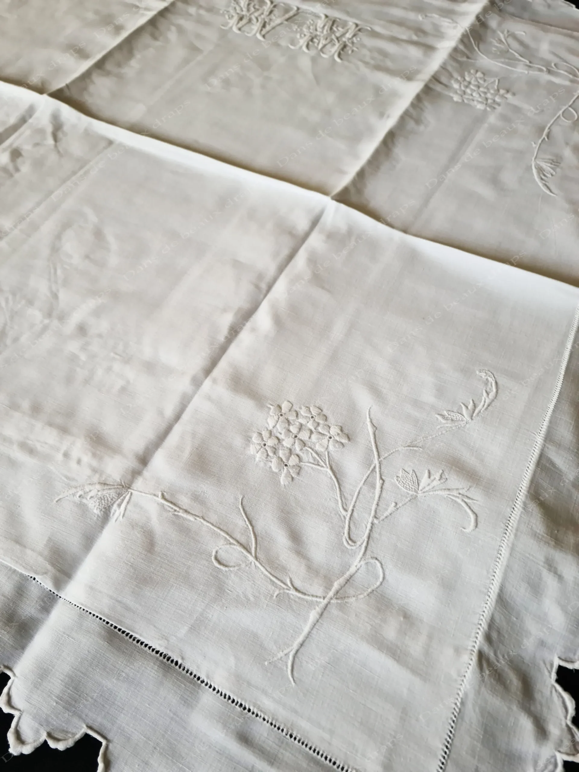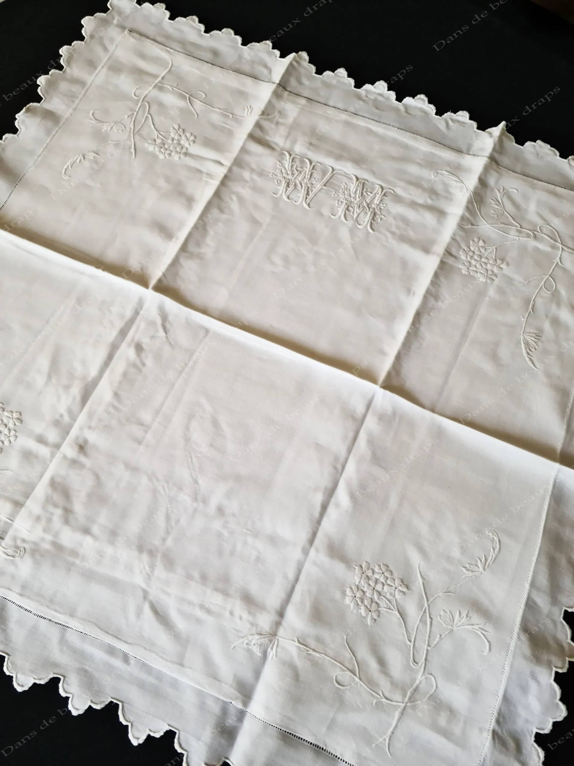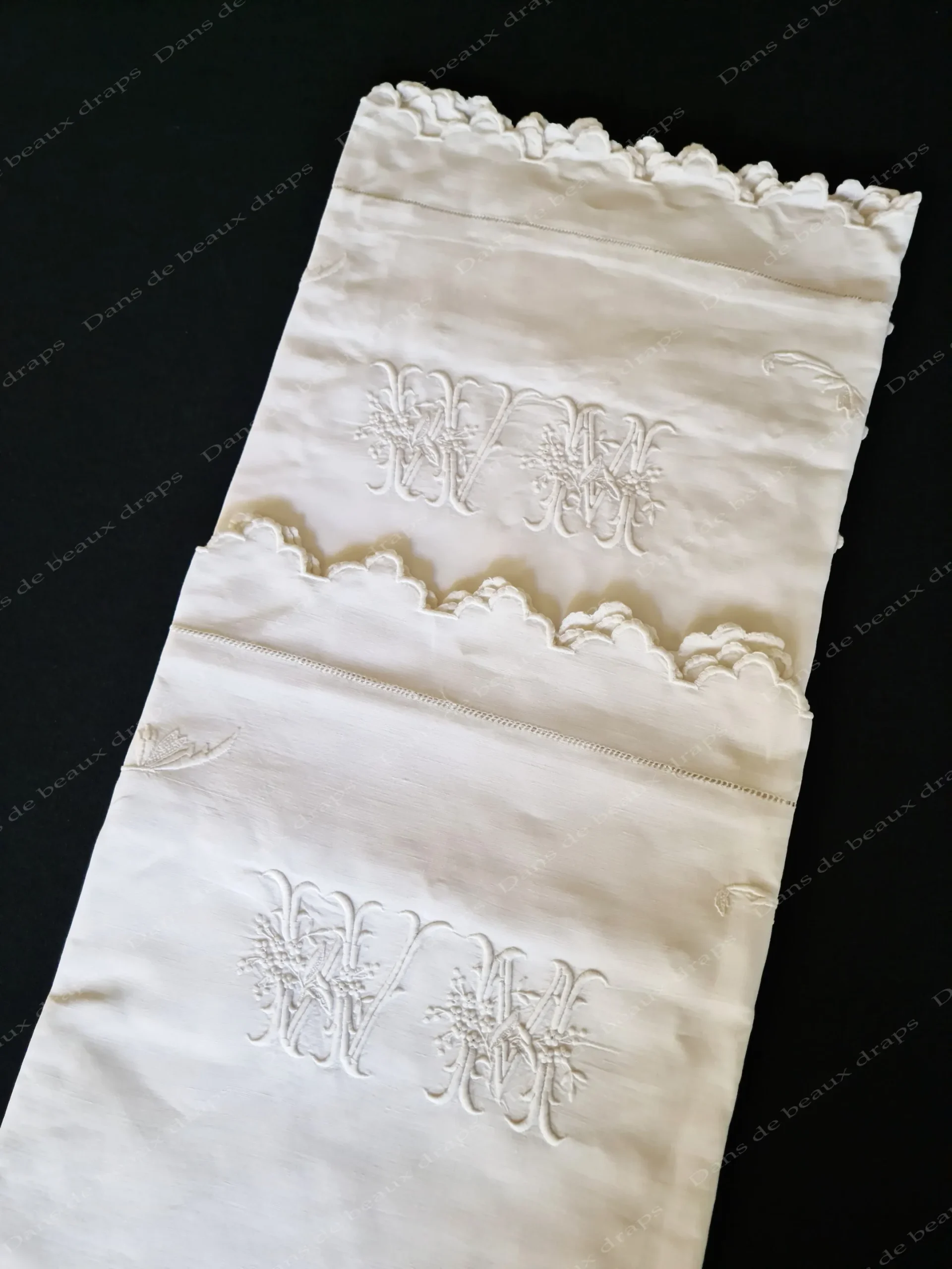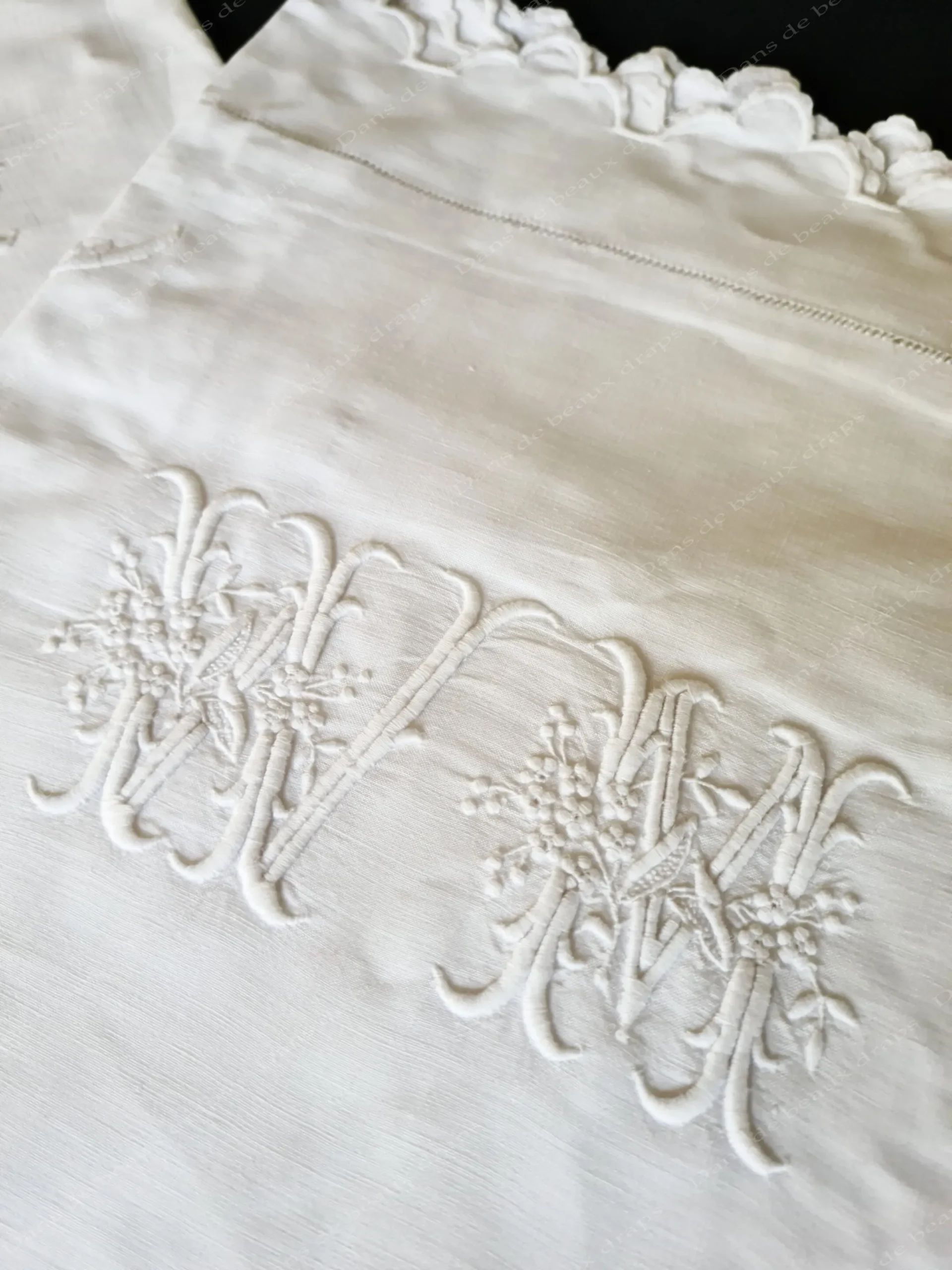 Sur le haut,au centre,un spectaculaire monogramme WM,très en relief brodé merveilleusement,entrelacé de fleurs.