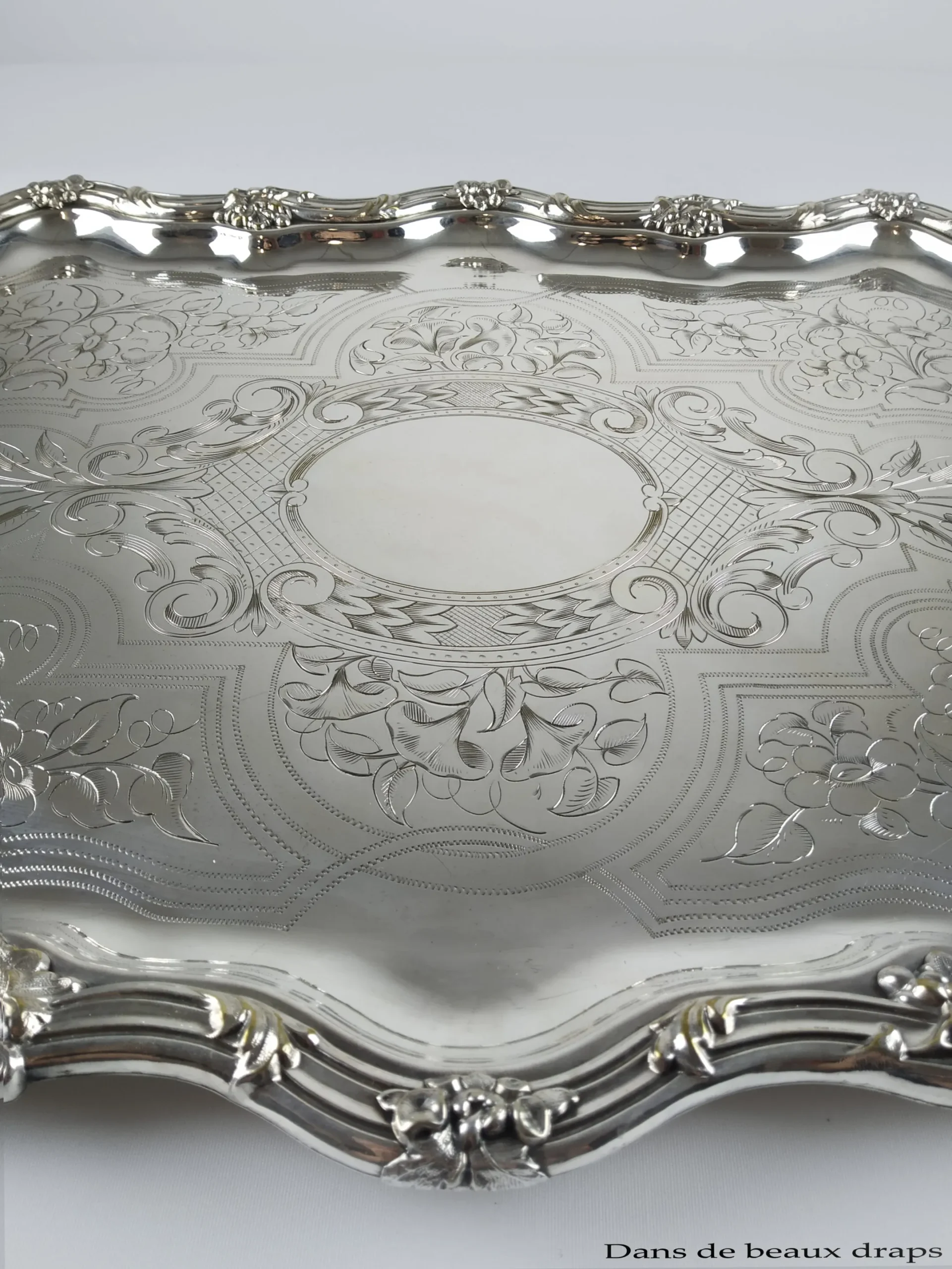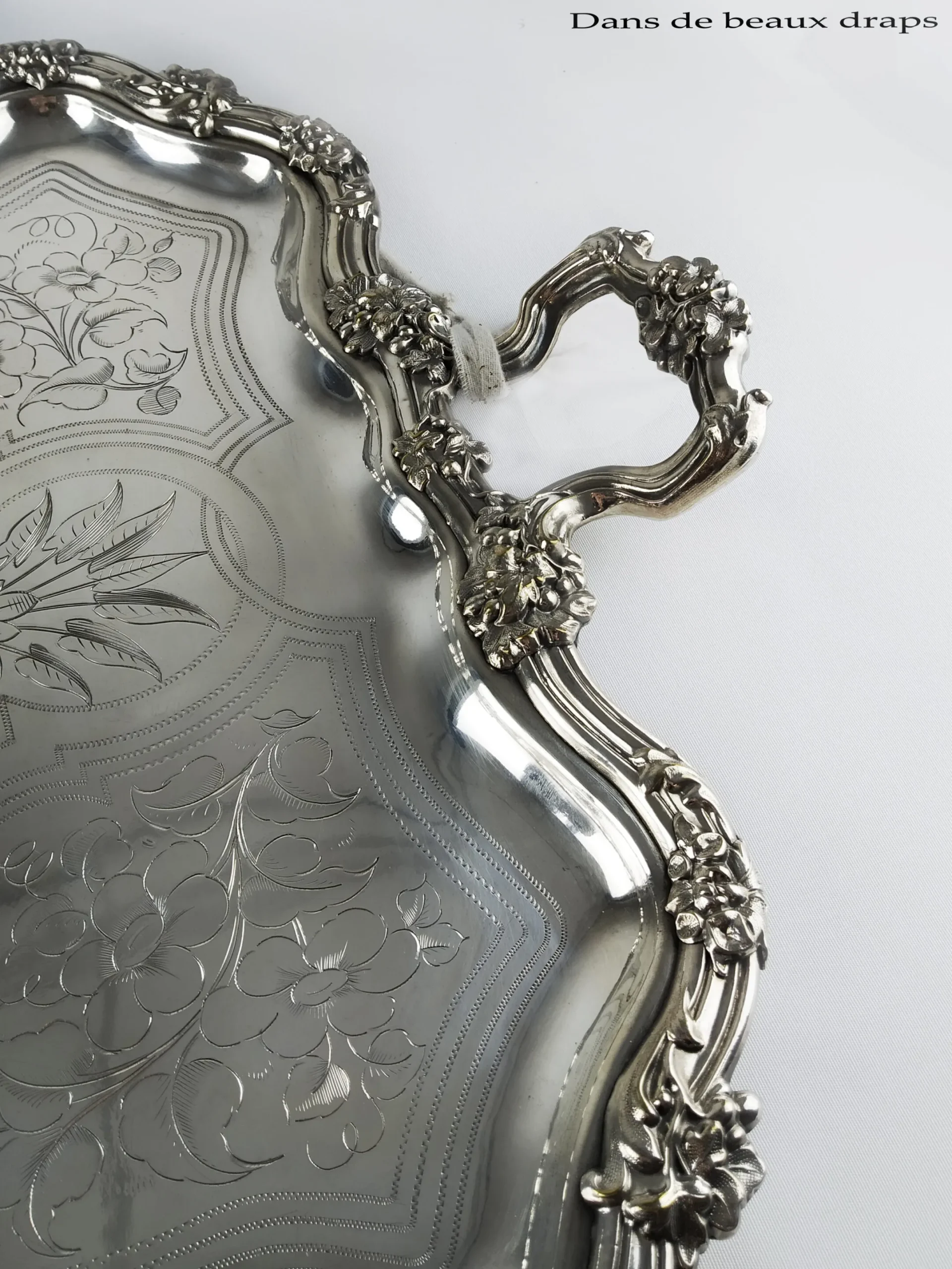 Magnifique plateau rectangulaire en métal argenté à décor floral, XIX ème.