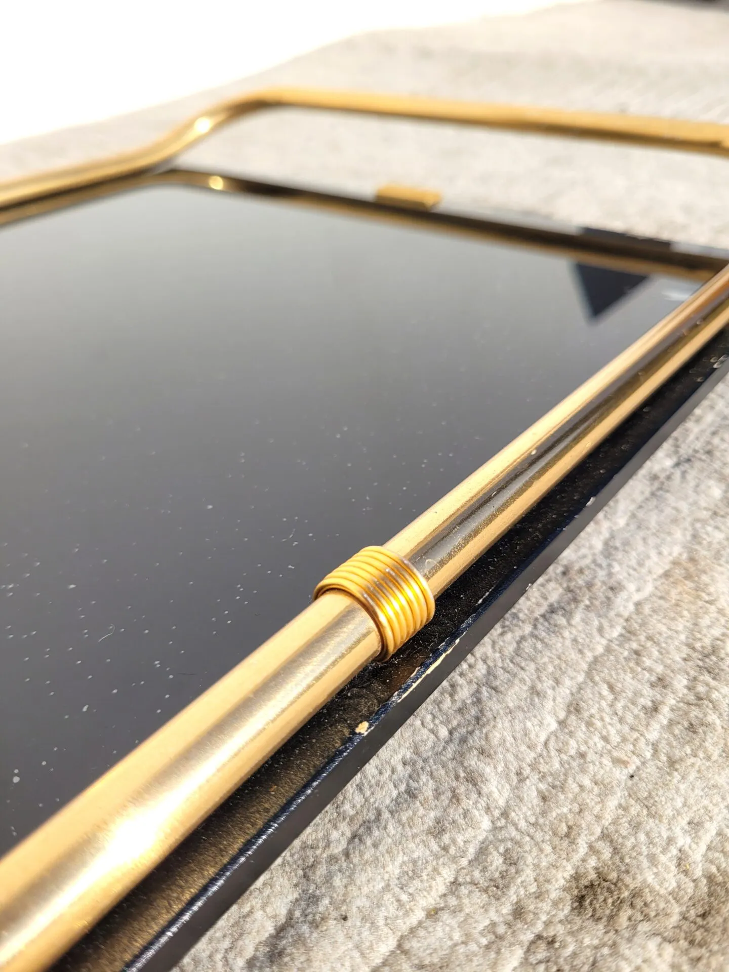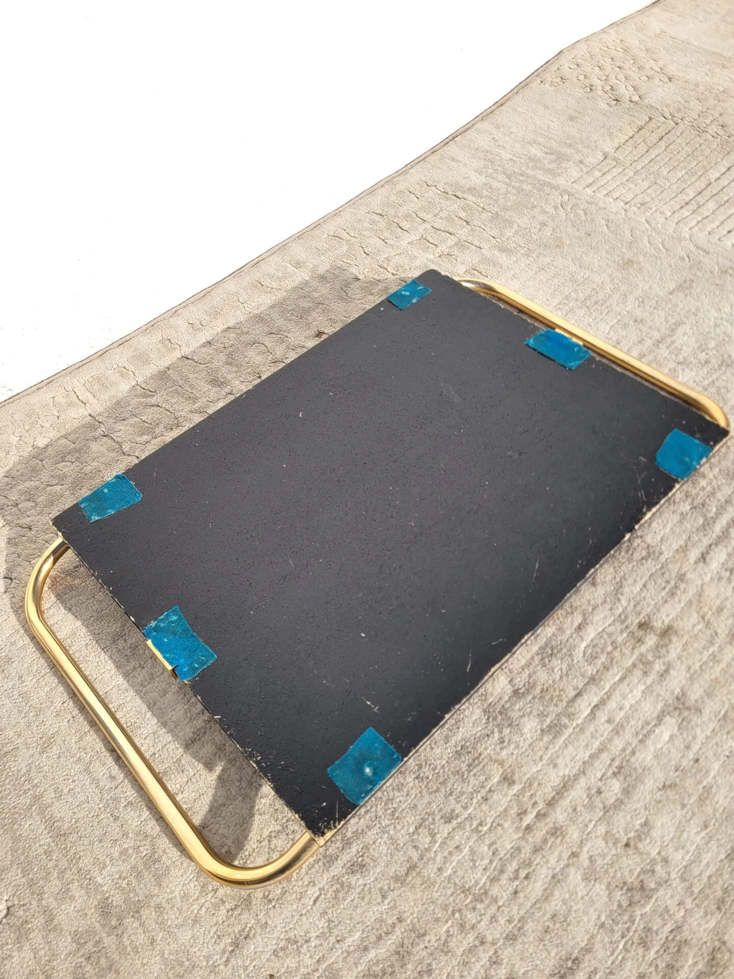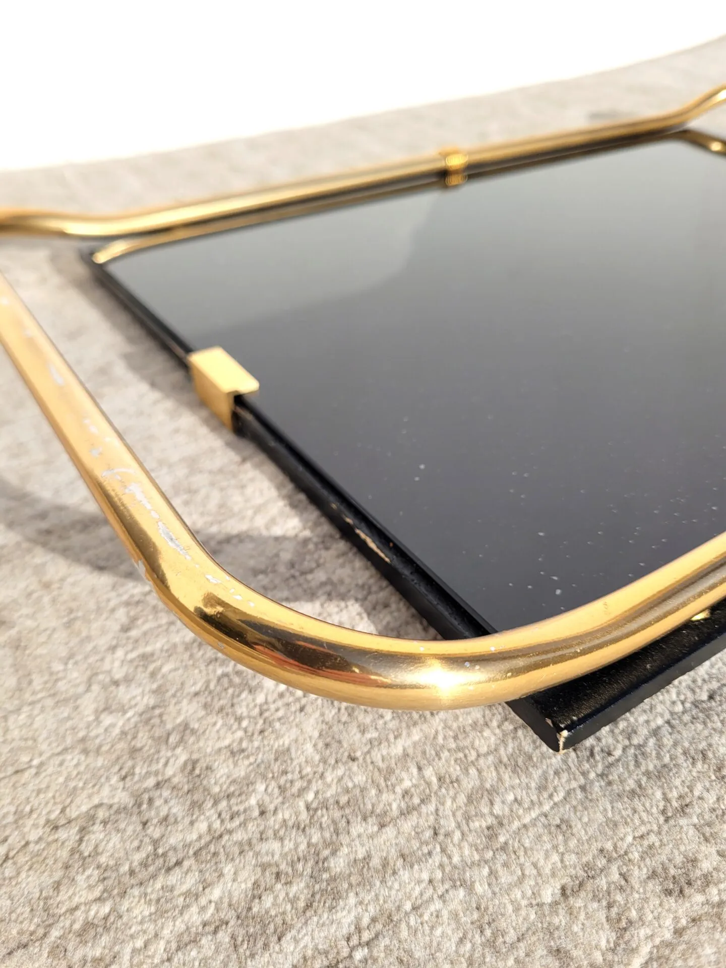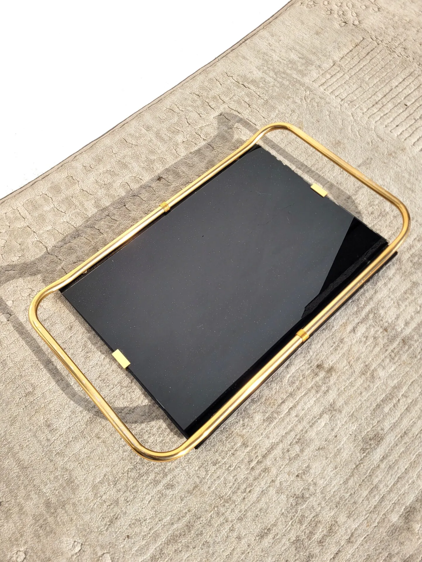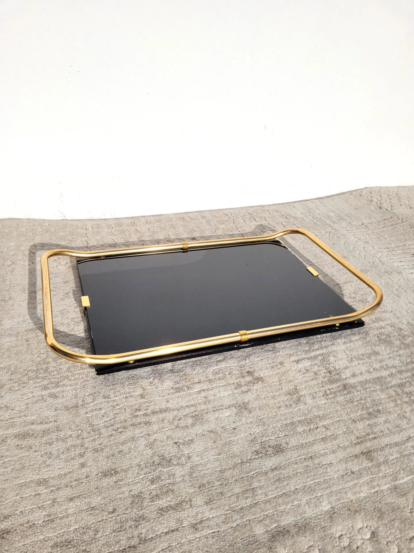 Il s’agit d’une plaque de verre fixé sur un plateau en bois laqué noir et poignées en métal doré