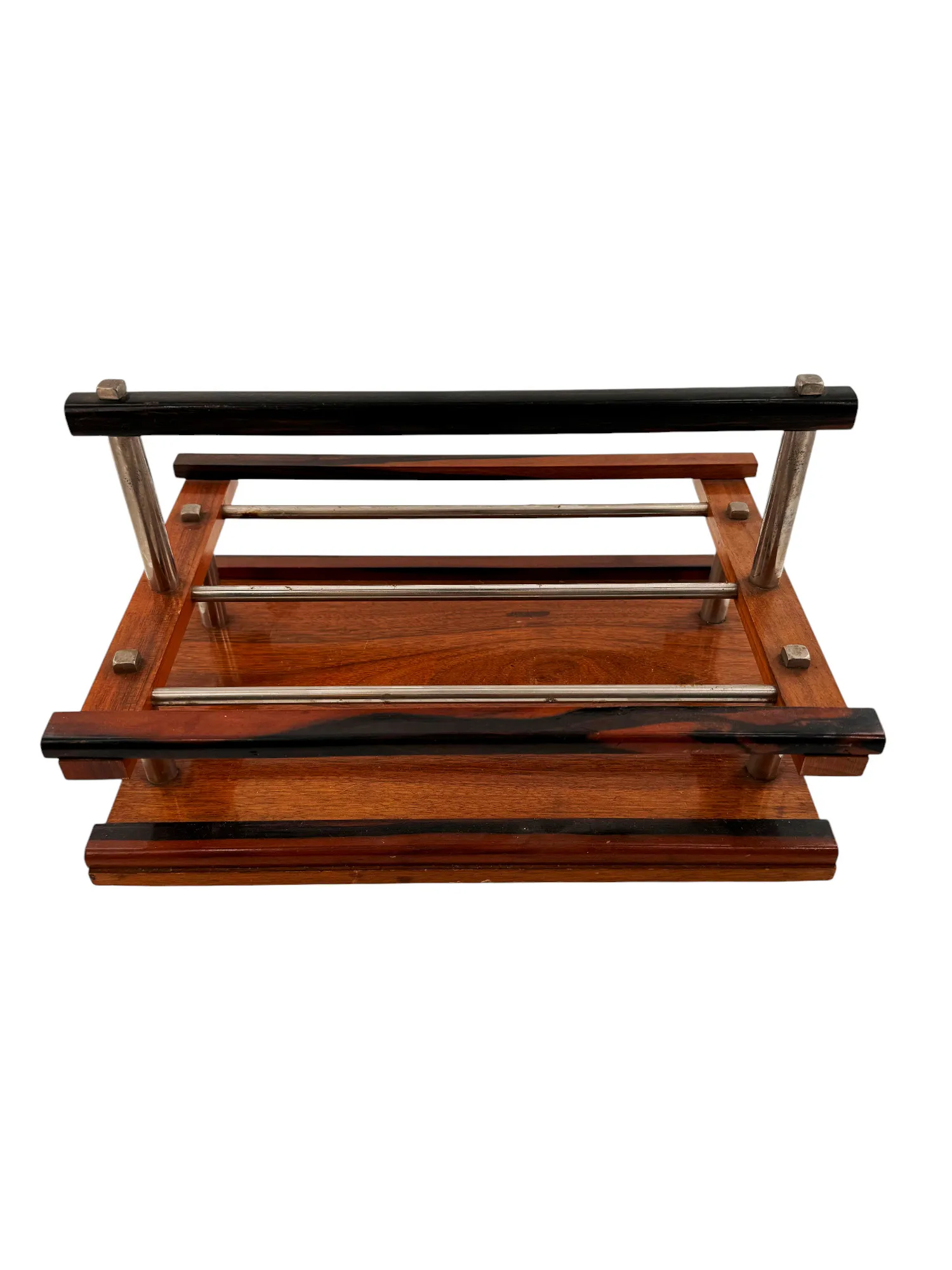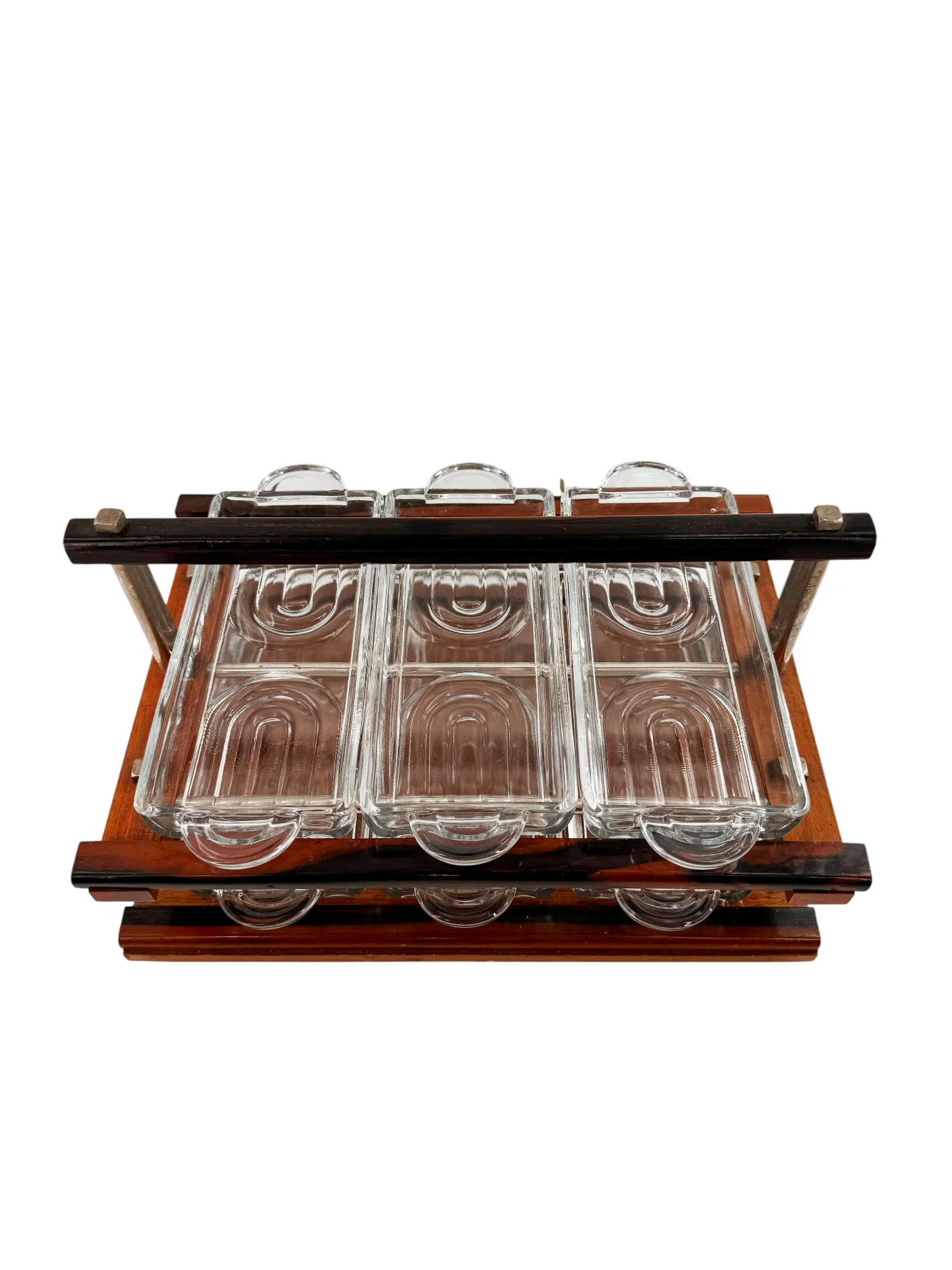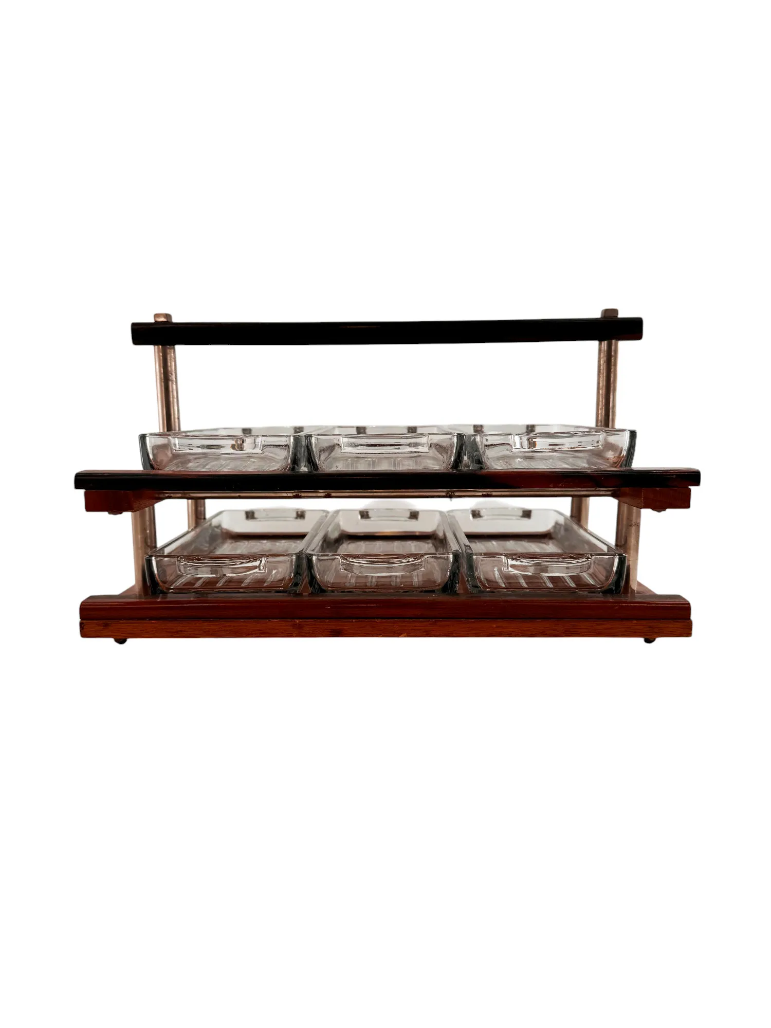En bois verni et noirci, à tubulaires chromé, à deux étages, il présente à chaque étage, 3 coupelles rectangulaires en verre.