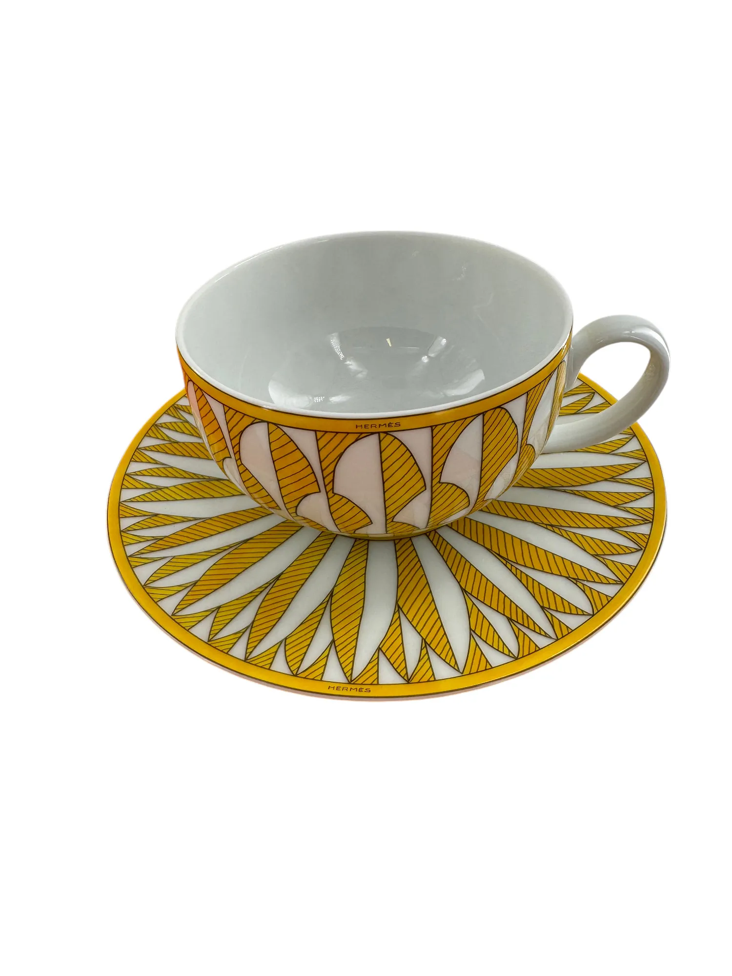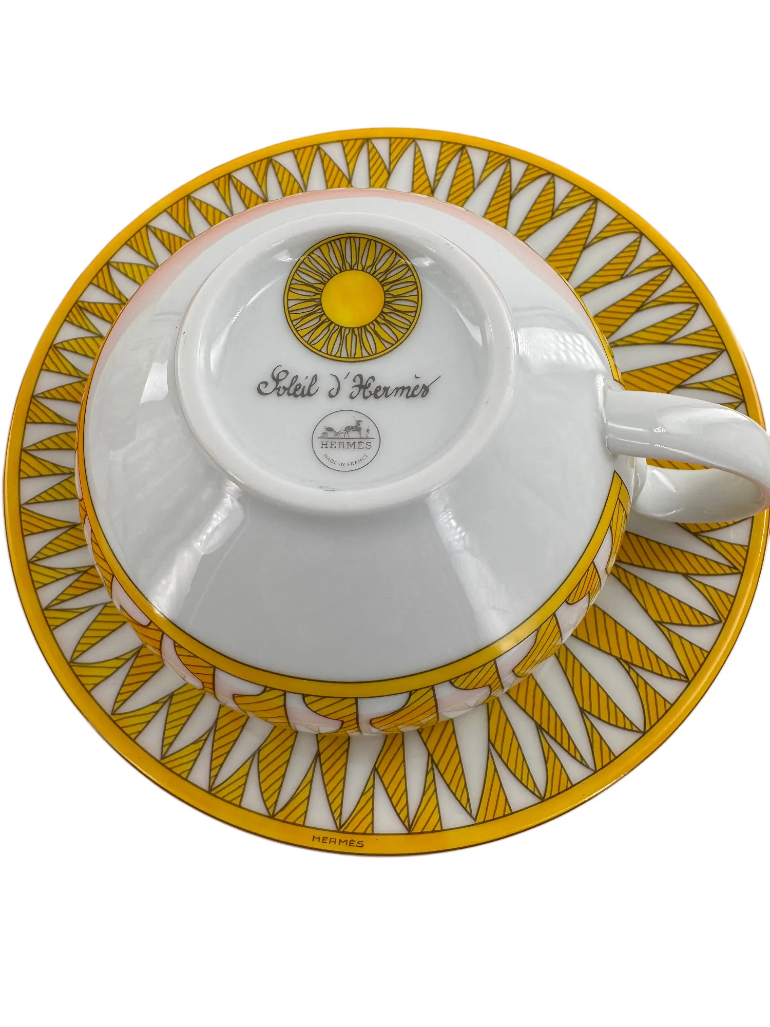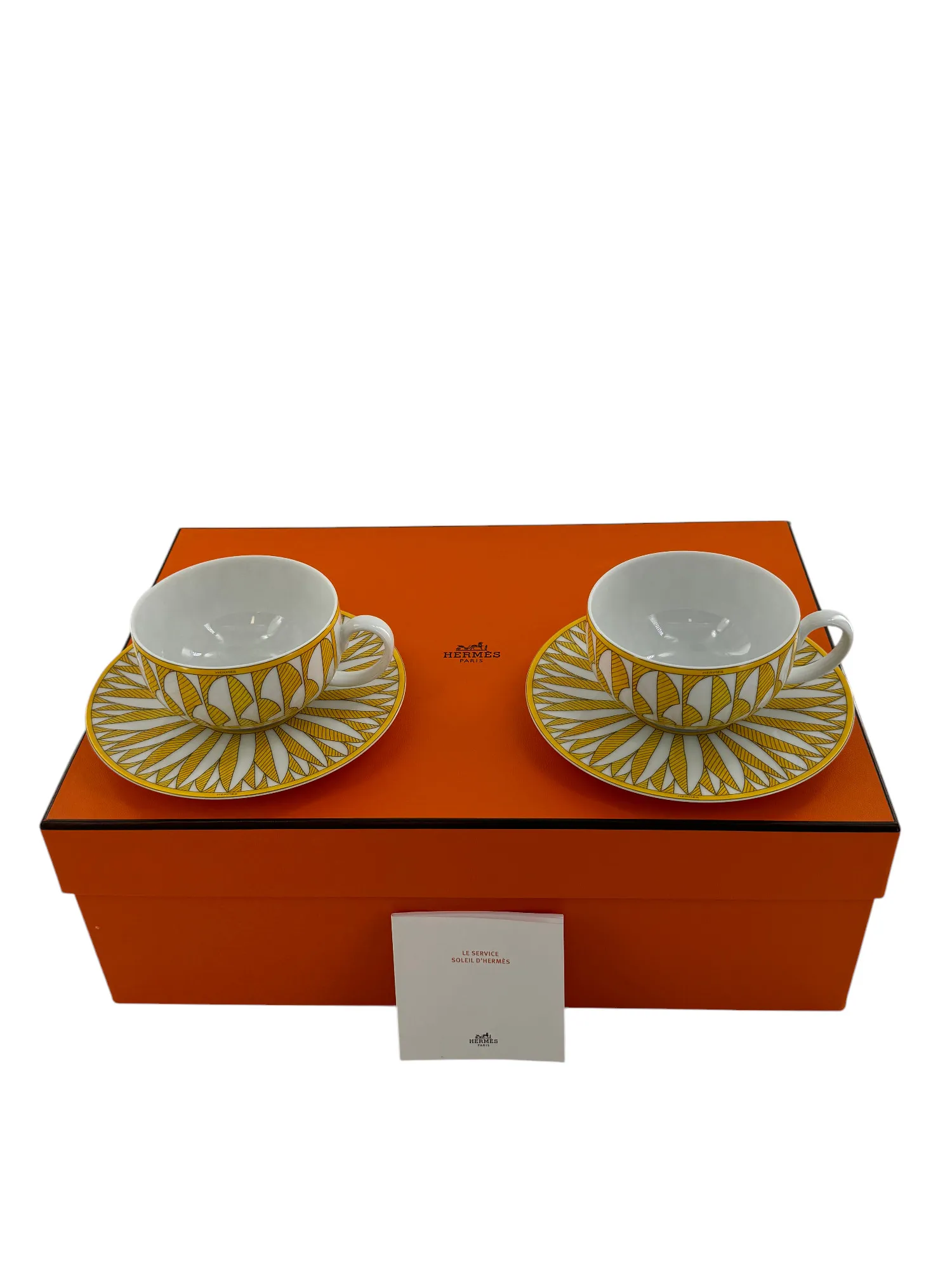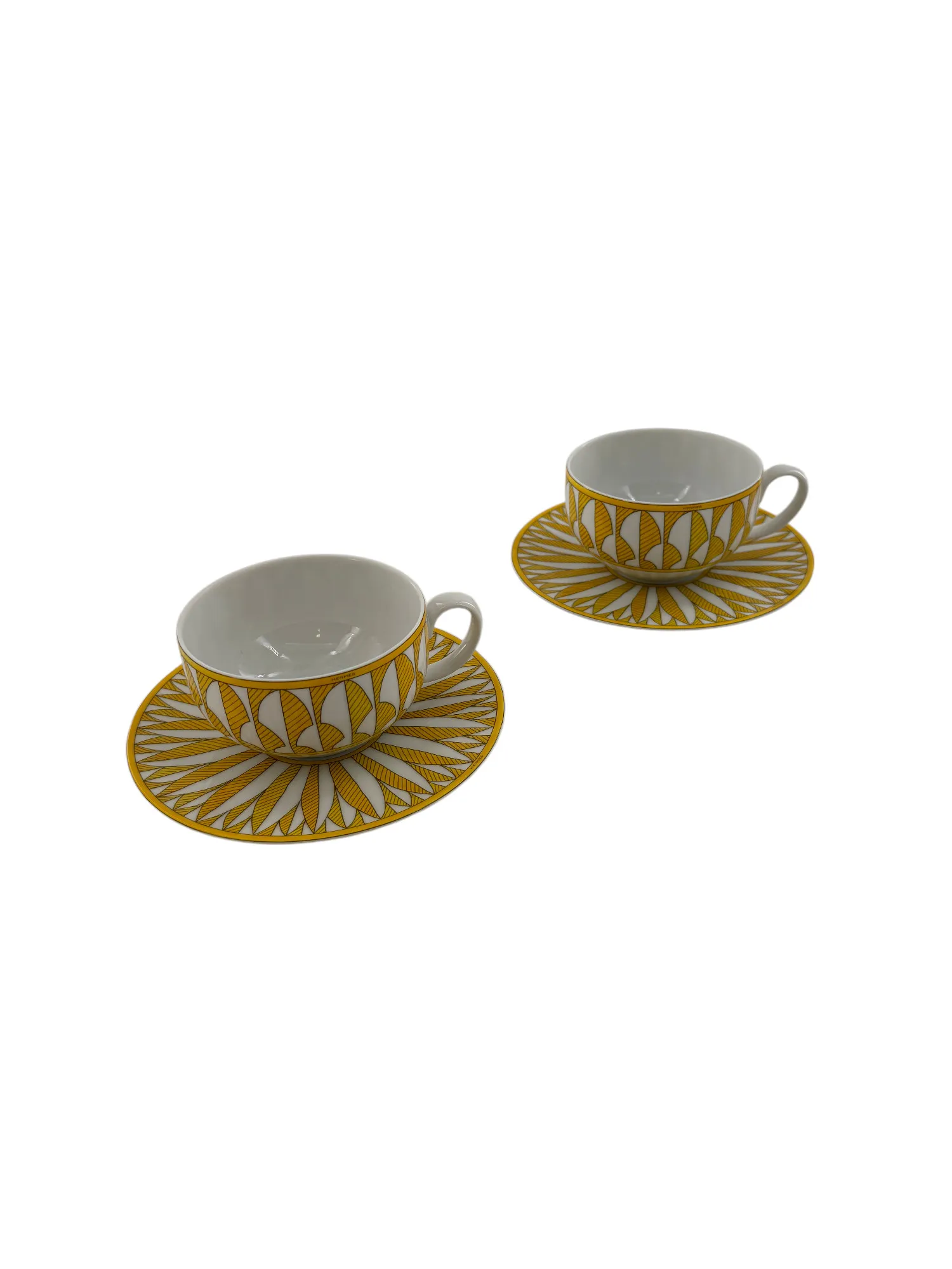 Rare ensemble de 2 paire-tasses à thé en porcelaine de Limoges, maison Hermès, modèle Soleil.