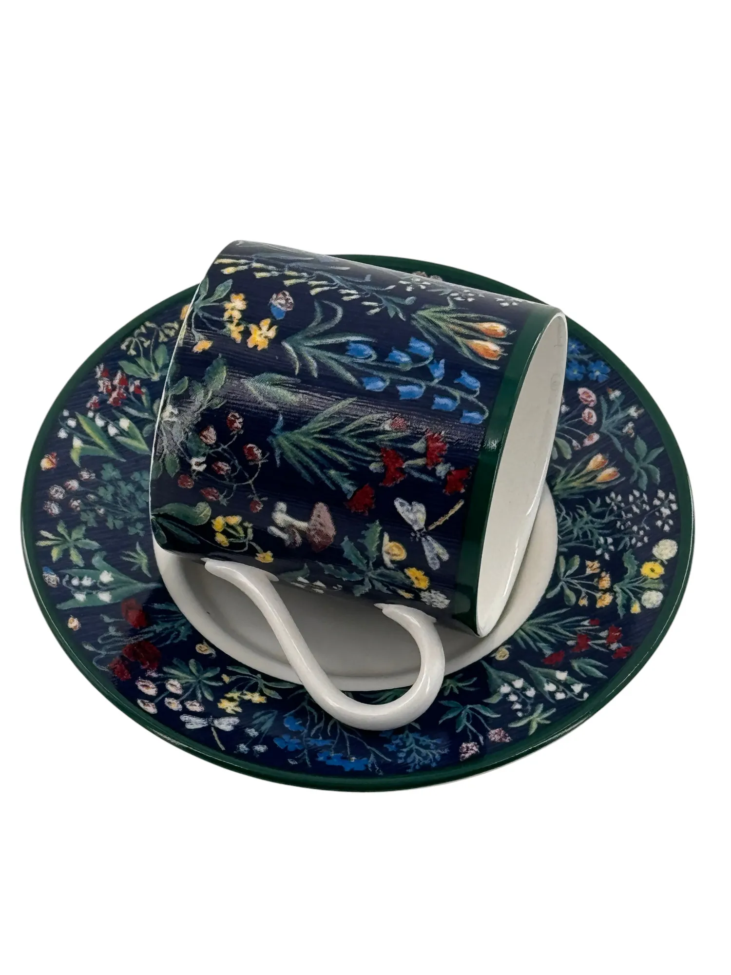 Fond bleu marine à décor de fleurs au naturel polychromes, insectes, champignons et escargots.