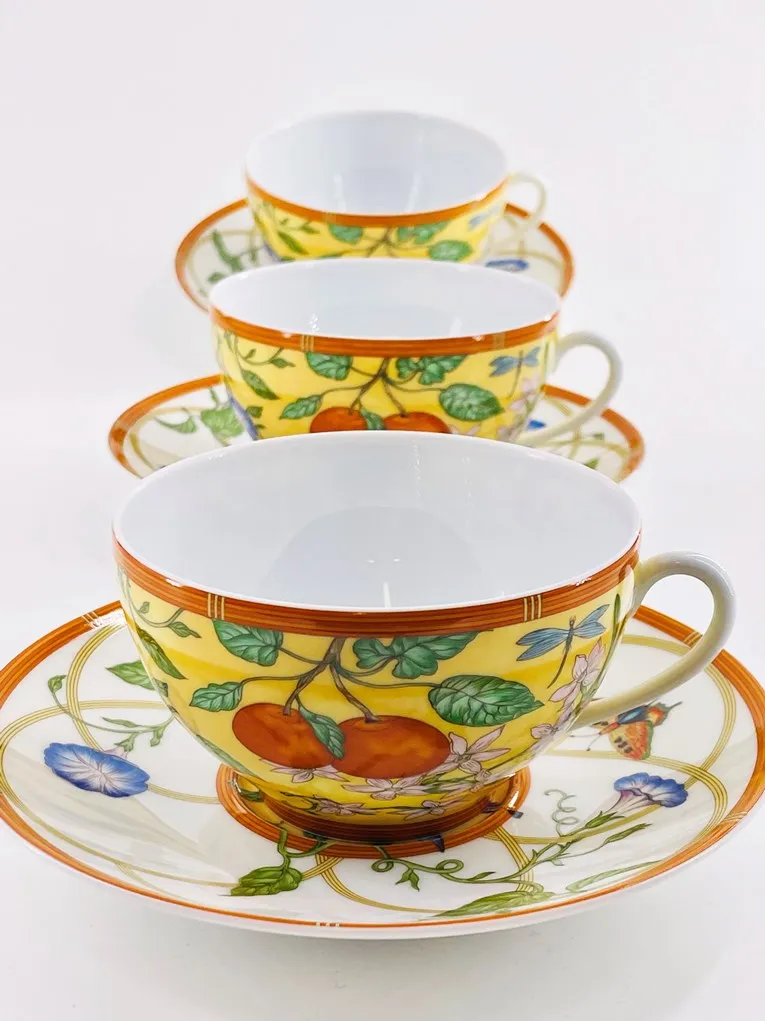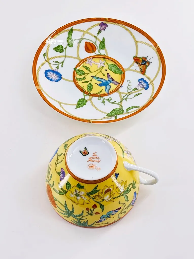 Rare paire-tasse à déjeuner en porcelaine de Limoges, maison Hermès, modèle Siesta.