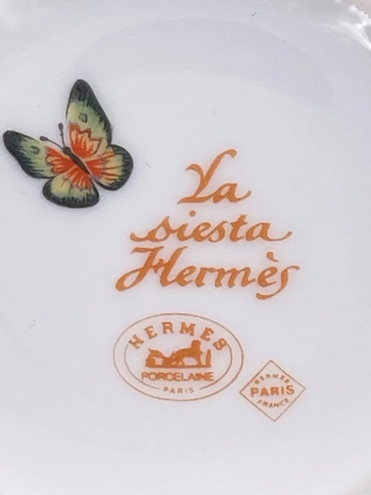 La signature Hermès en lettres bâton est présente sur le filet de la soucoupe et du bol et l’estampille sous la soucoupe et le bol.