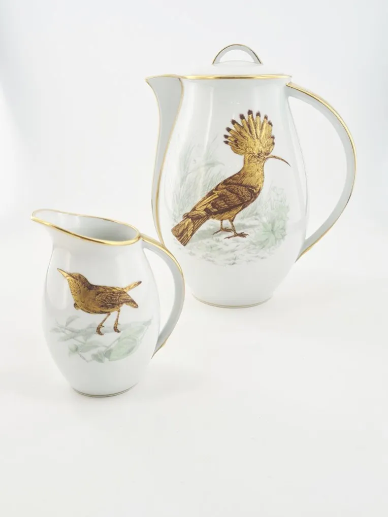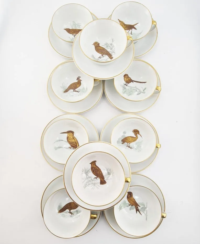 Rare partie de service à café en porcelaine de Limoges , maison Bernardaud, modèle » Les Oiseaux d’Or » , 22 pièces.