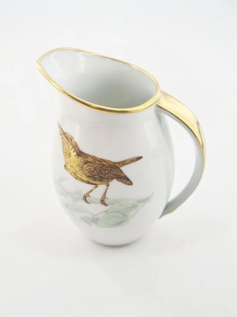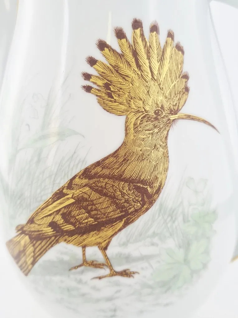 En porcelaine blanche, filet or, chaque pièce présente un oiseau différent au naturel doré, mat et brillant.
