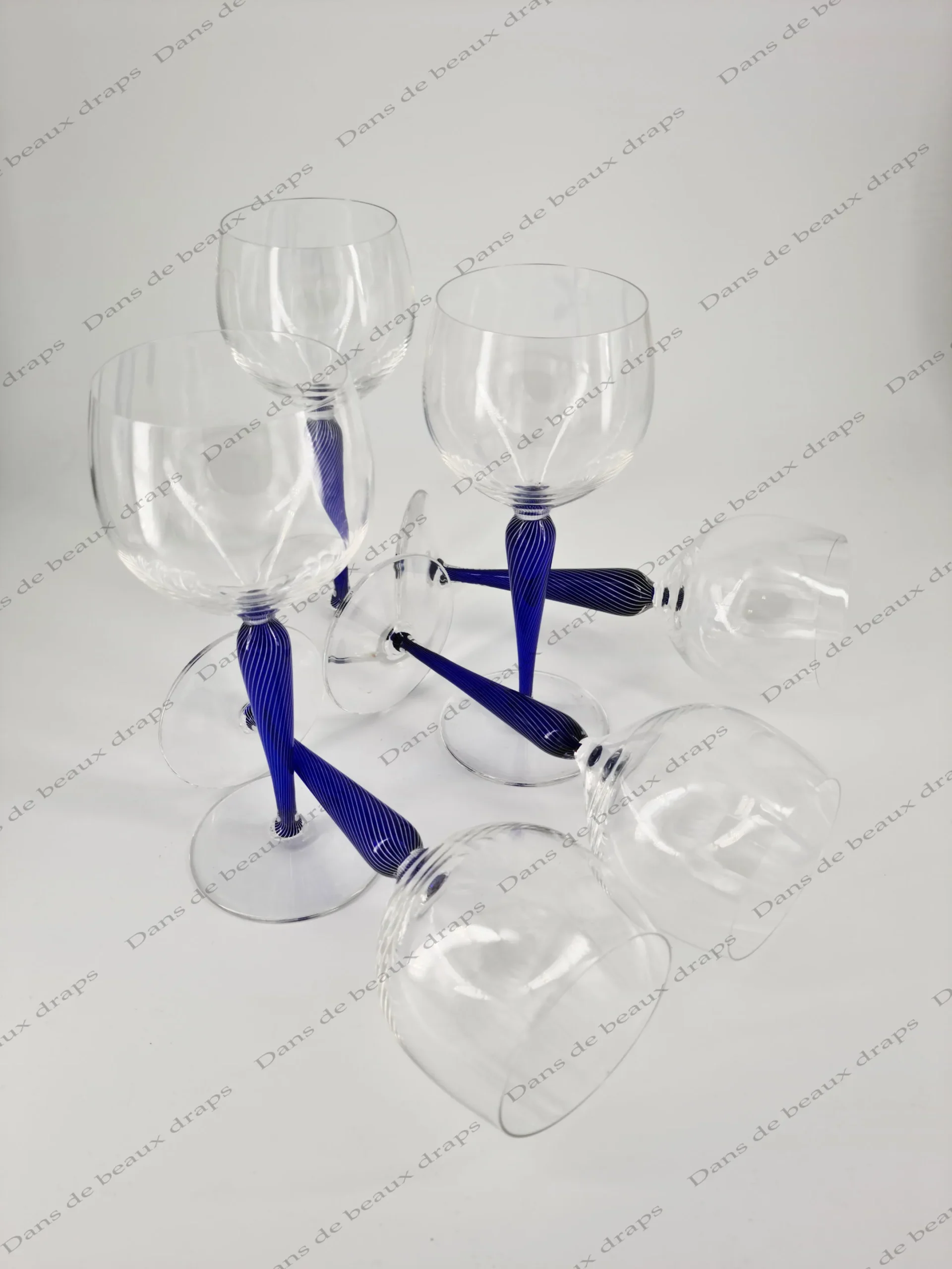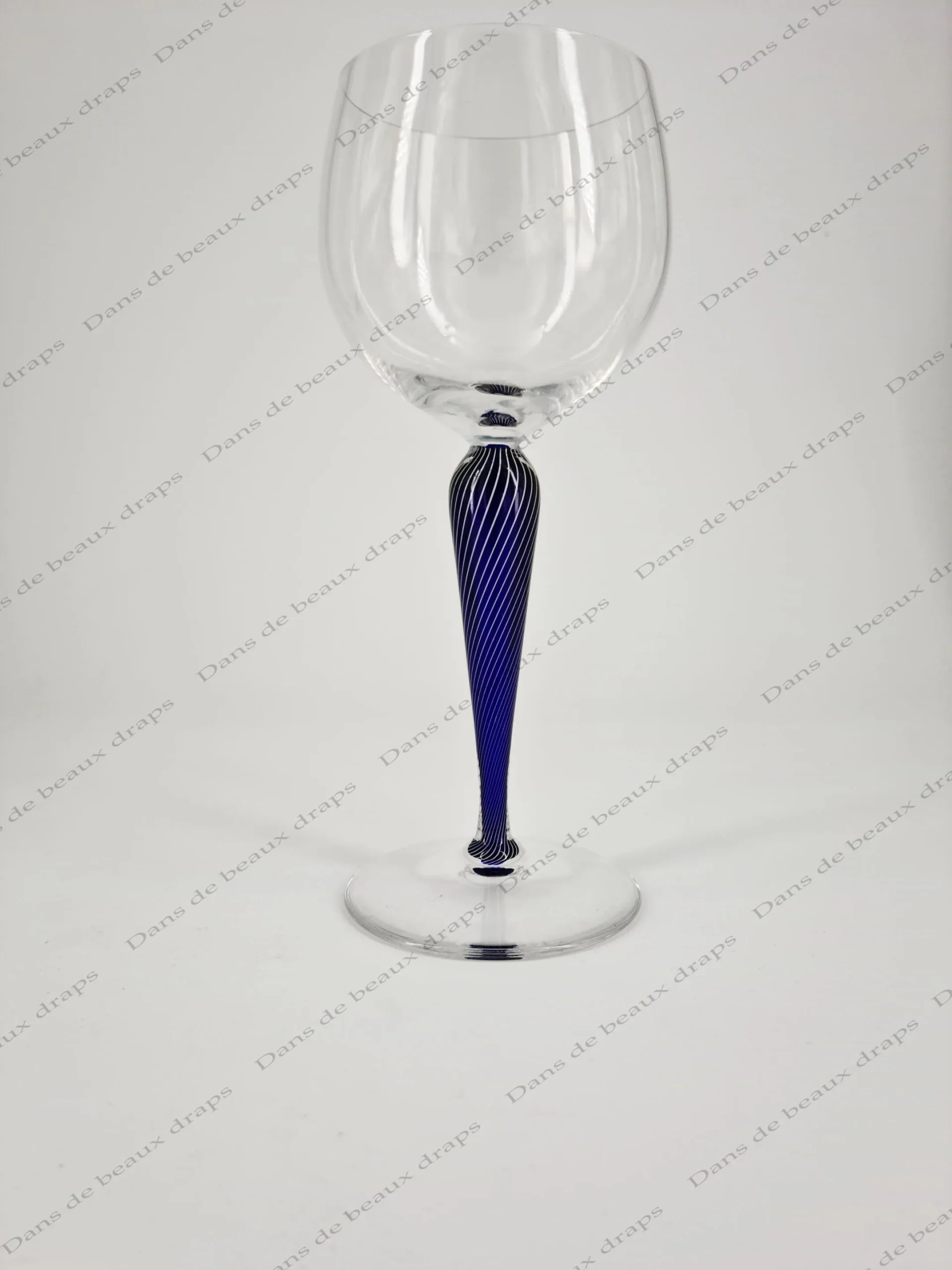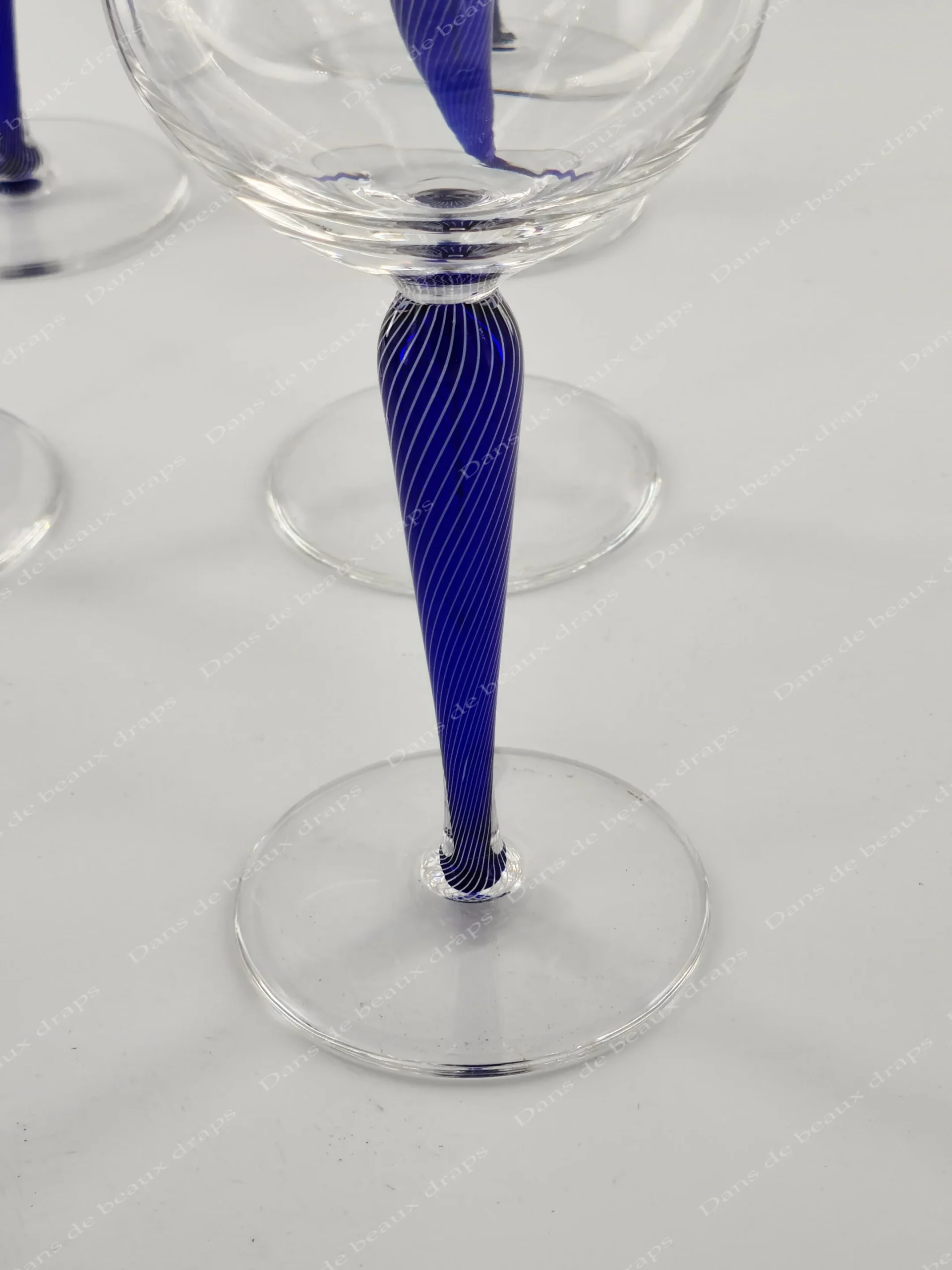 Rare suite de 6 verres en cristal de St Louis, jambe filigranée bleu cobalt.