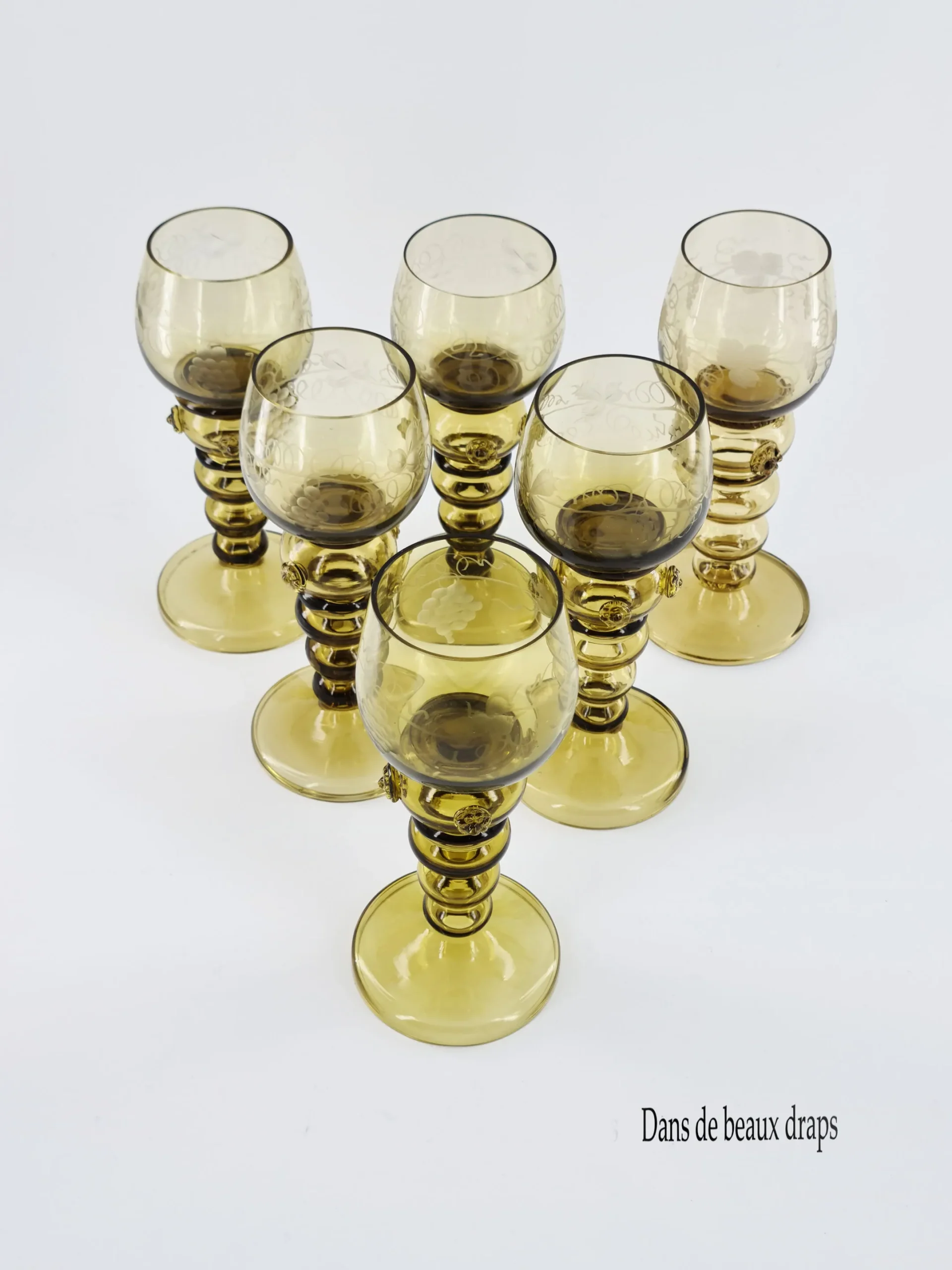 Série de 12 verres à vin blanc en cristal de Bohême de couleur vert olive, XIX ème.