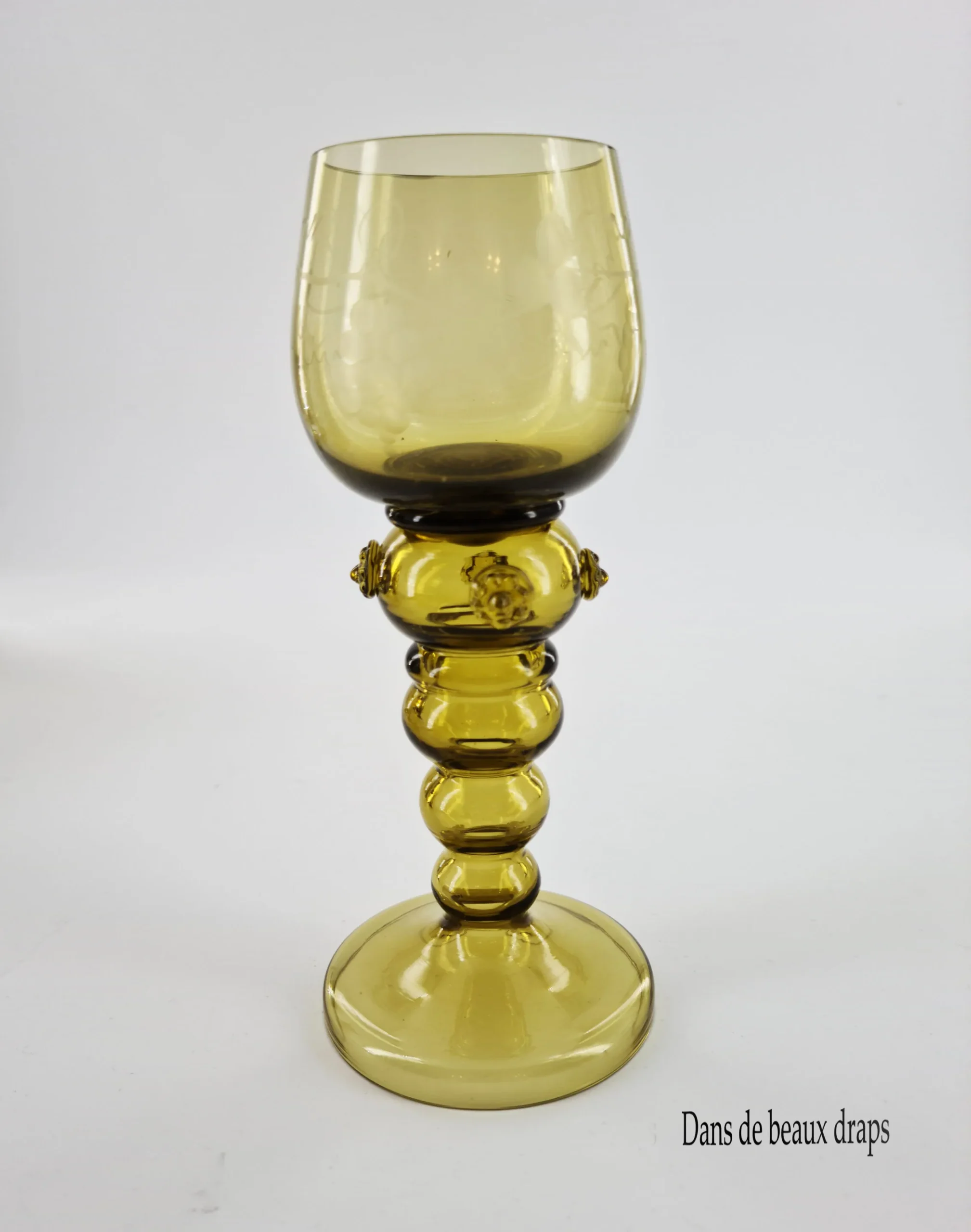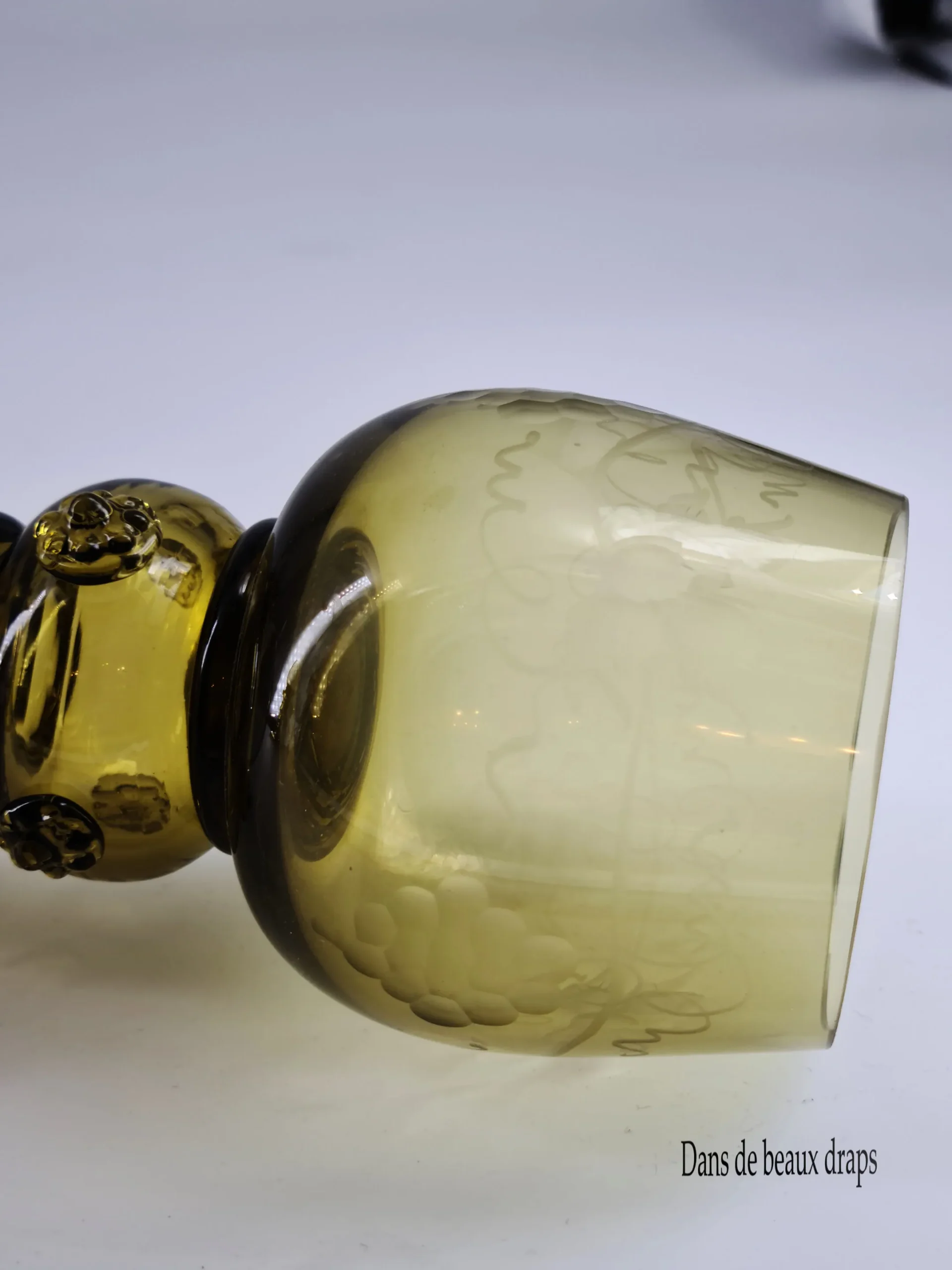 Jambe creuse soufflée, pied rond, buvant corole à décor de pampres de vignes et de grappes de raisin.