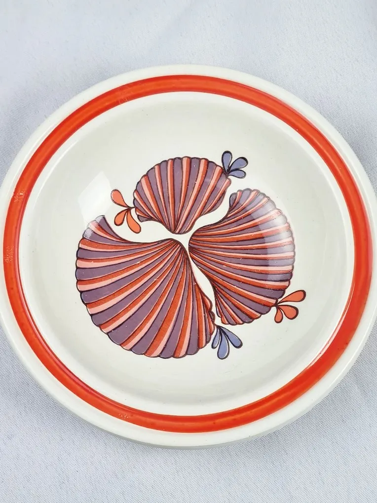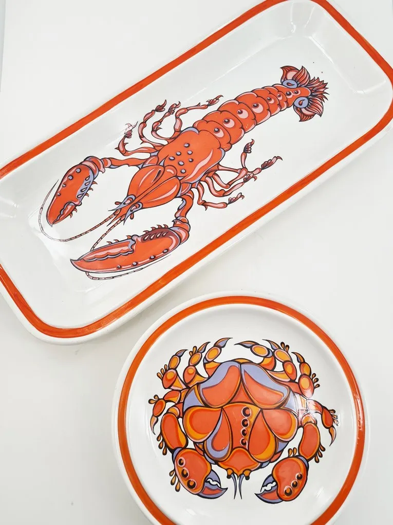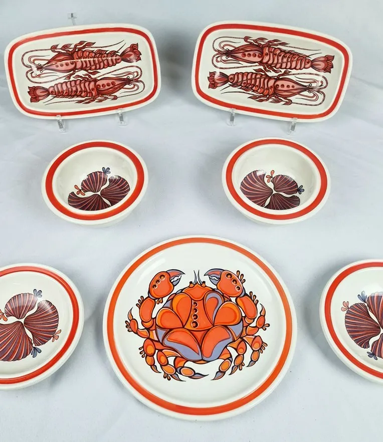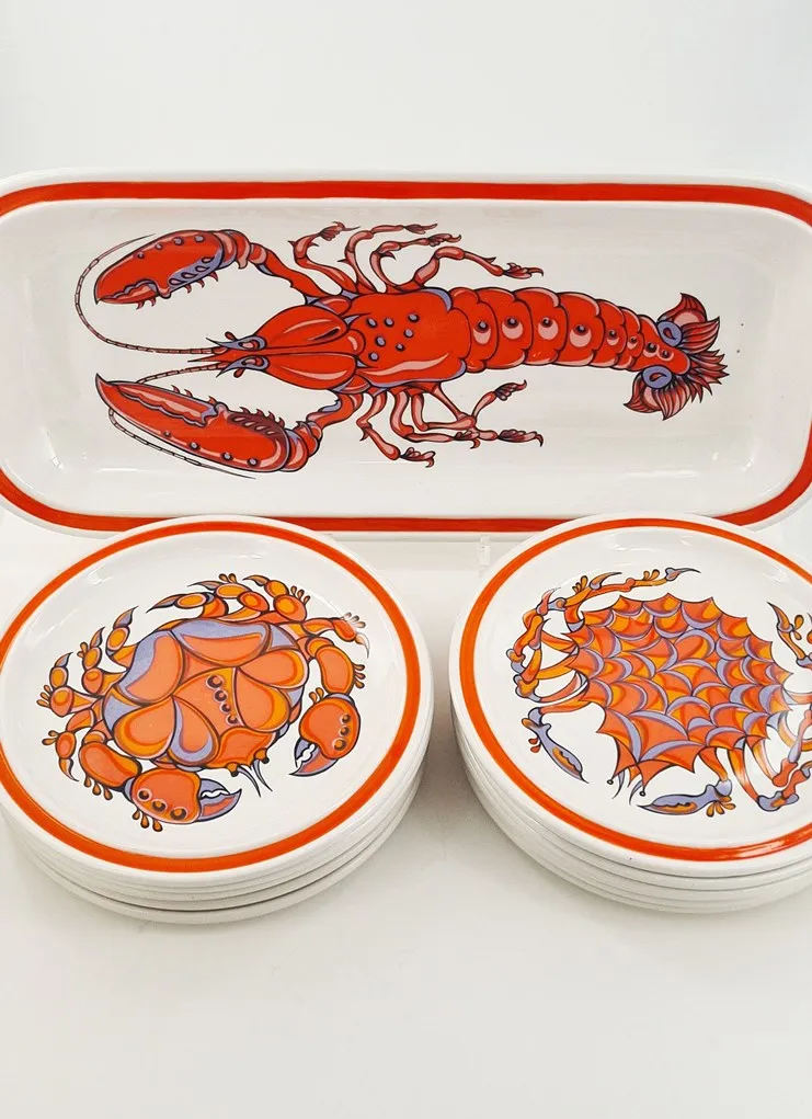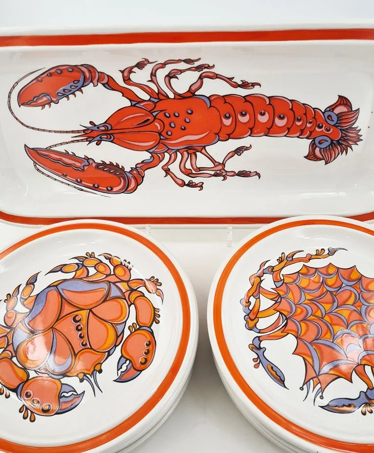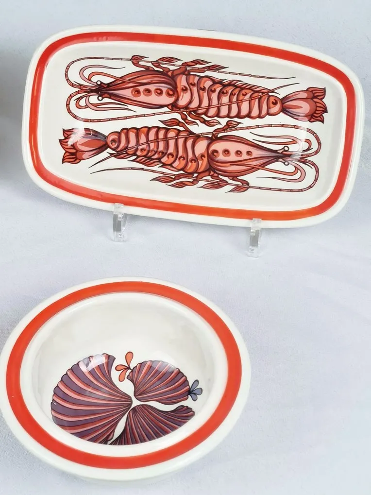 Amusant décor sérigraphié polychrome de crustacés et de coquillages en camaïeu d’orangé.