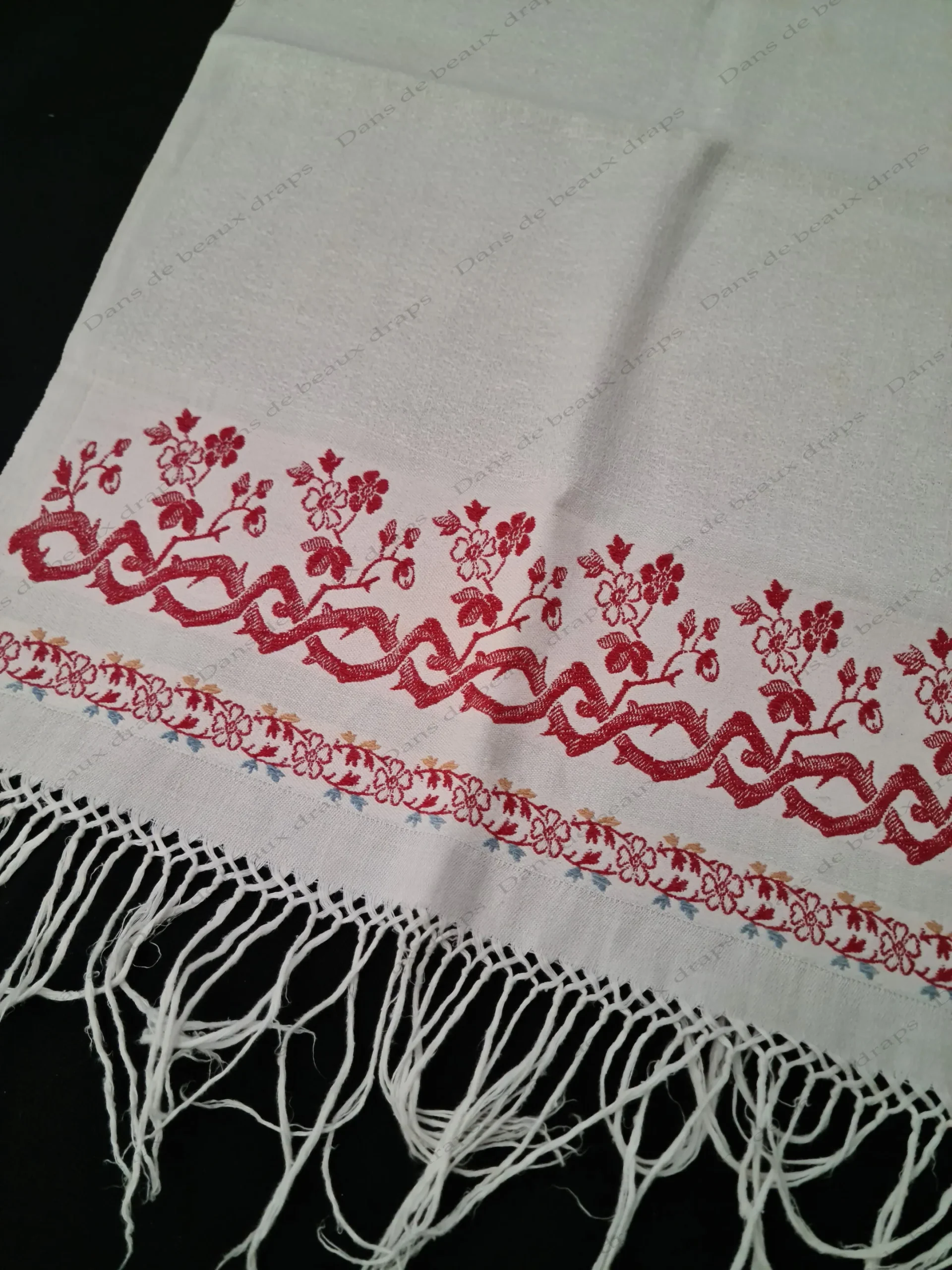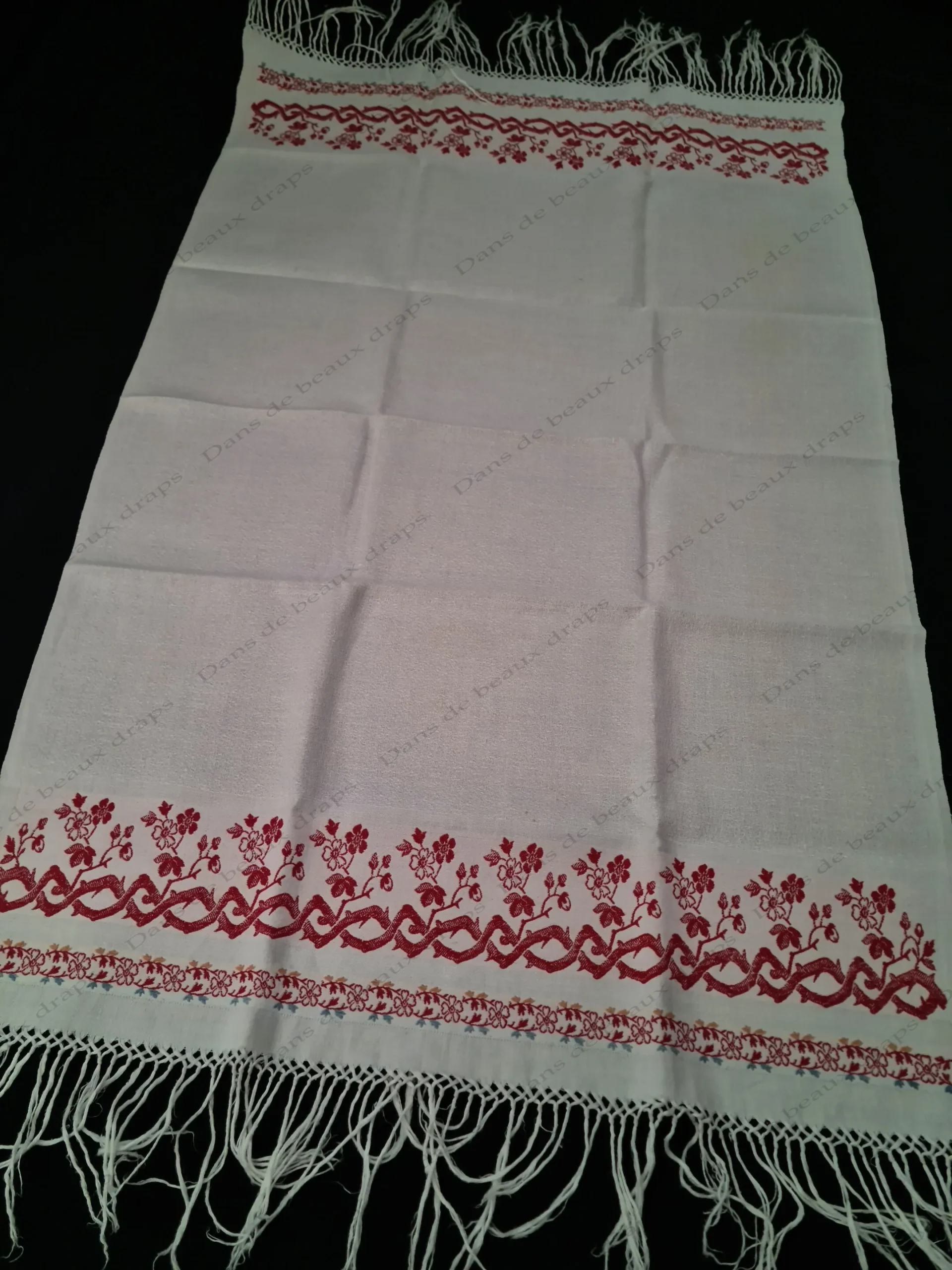 Dimensions : longueur hors franges: 90 cm/longueur totale: 110 cm/largeur:59 cm.
