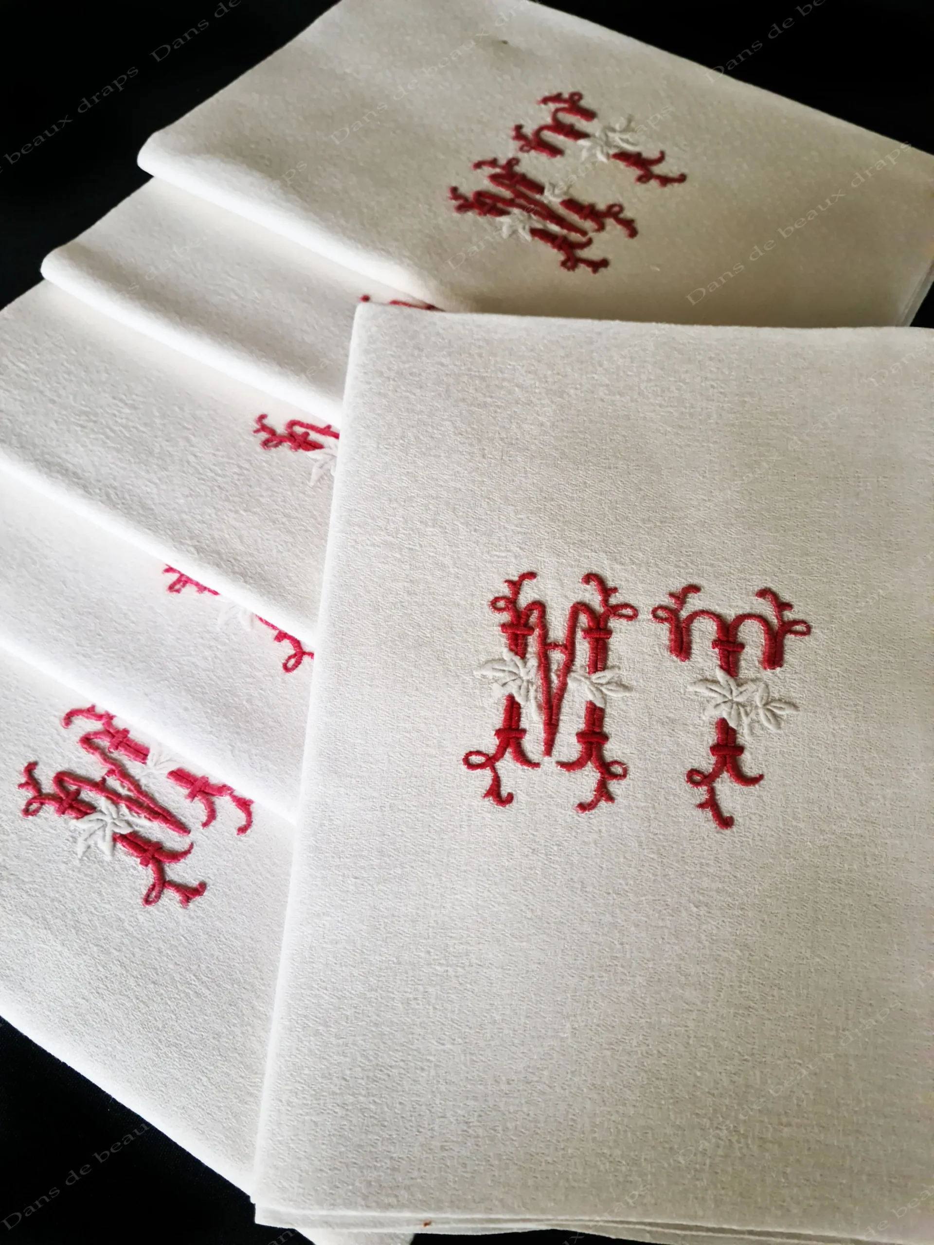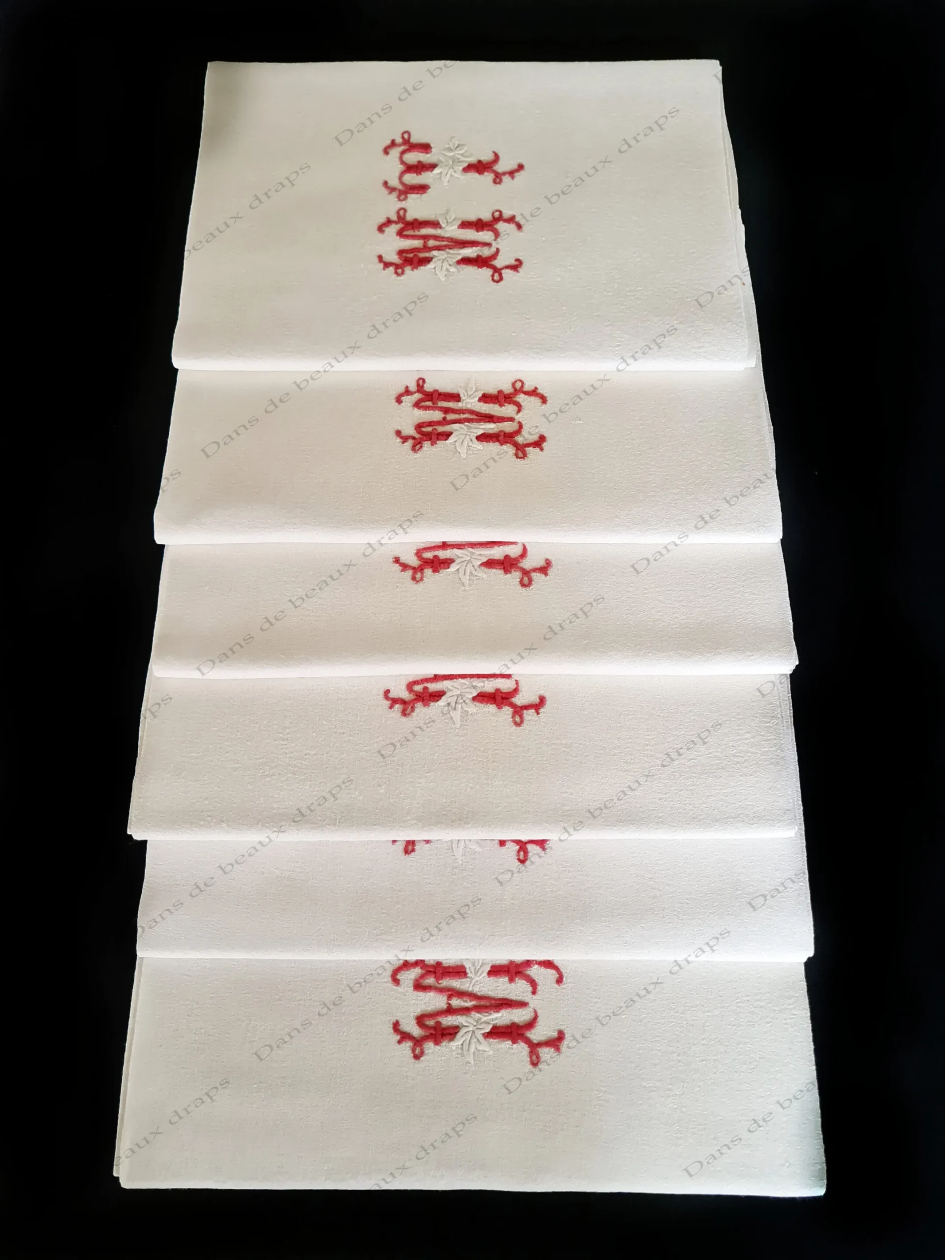 Suite de 6 très belles serviettes en damassé de lin monogramme MT.