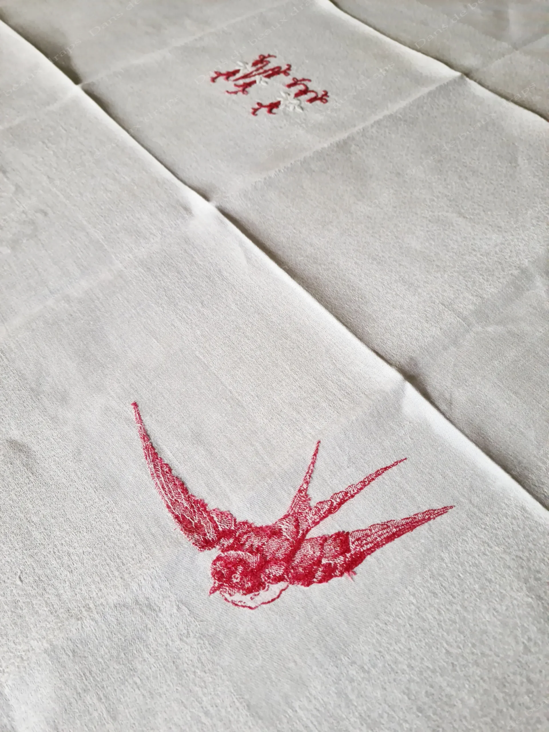 Rare décor d’hirondelles tissées de couleur rouge et blanche aux 4 angles (14 cm par 11 cm).
