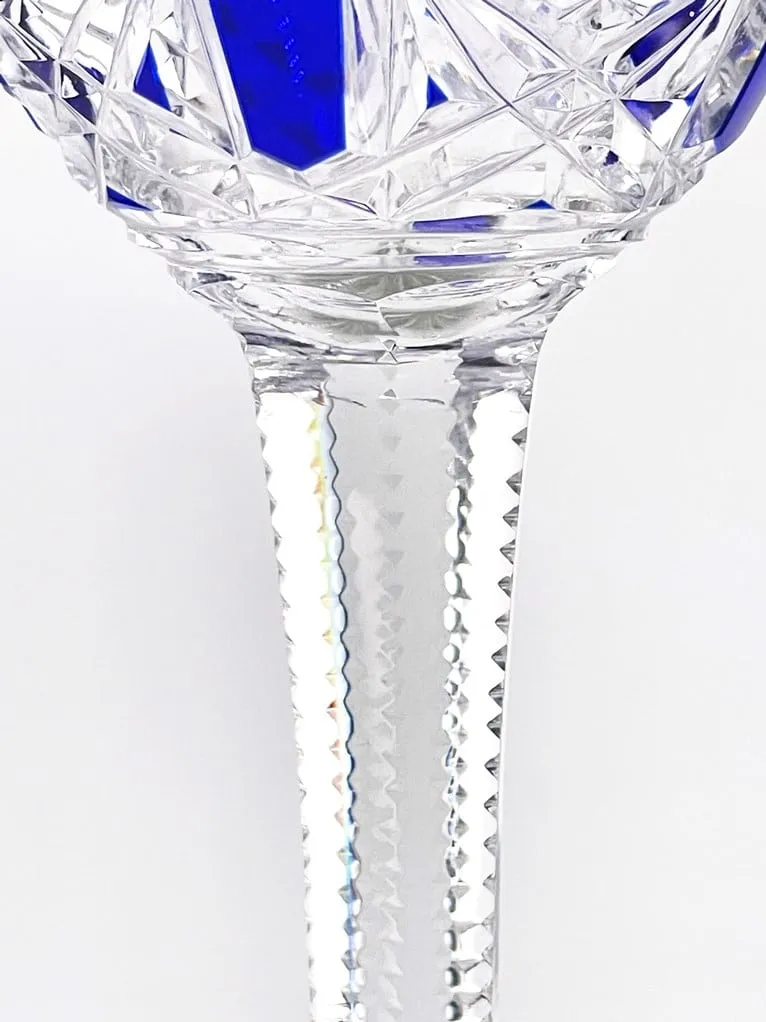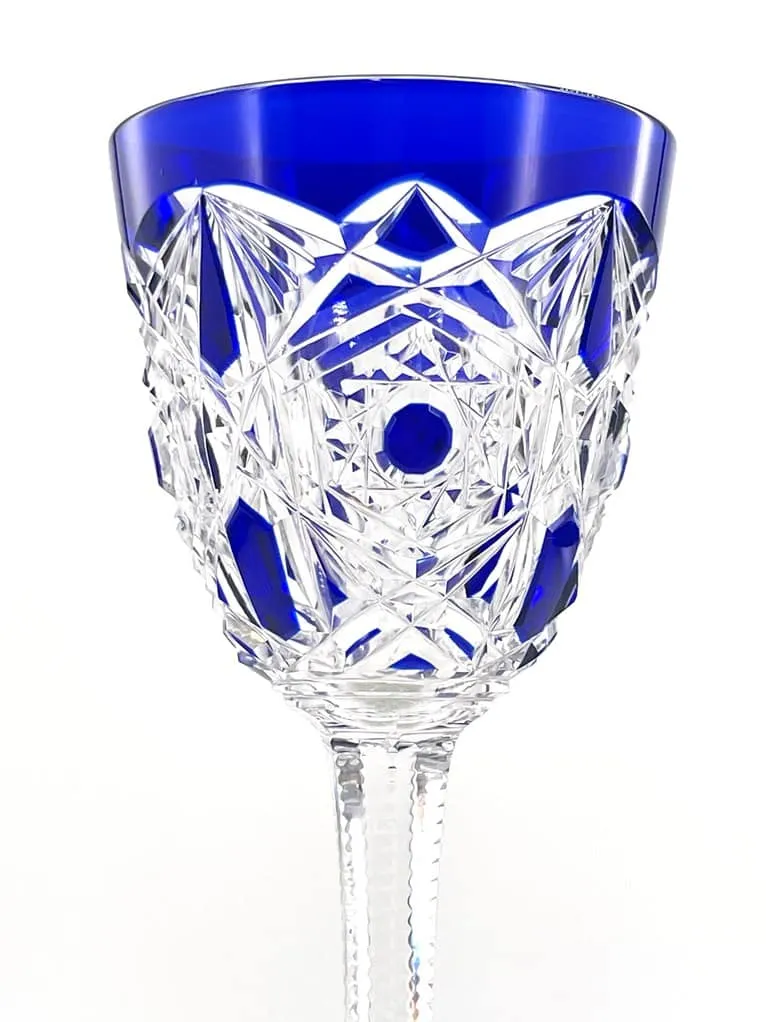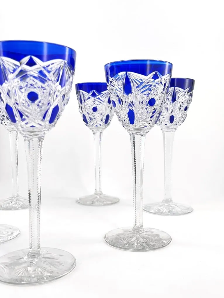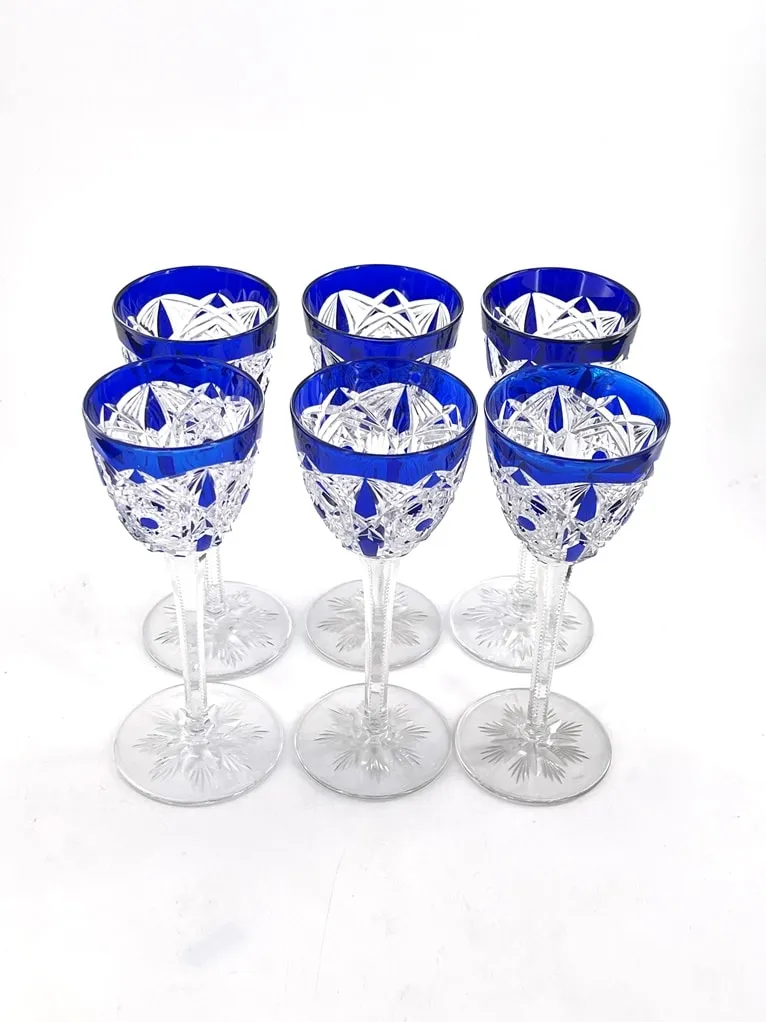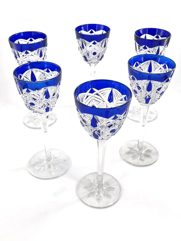 Suite de 6 verres à vin du Rhin en cristal de Baccarat, modèle Lagny, bleu cobalt.