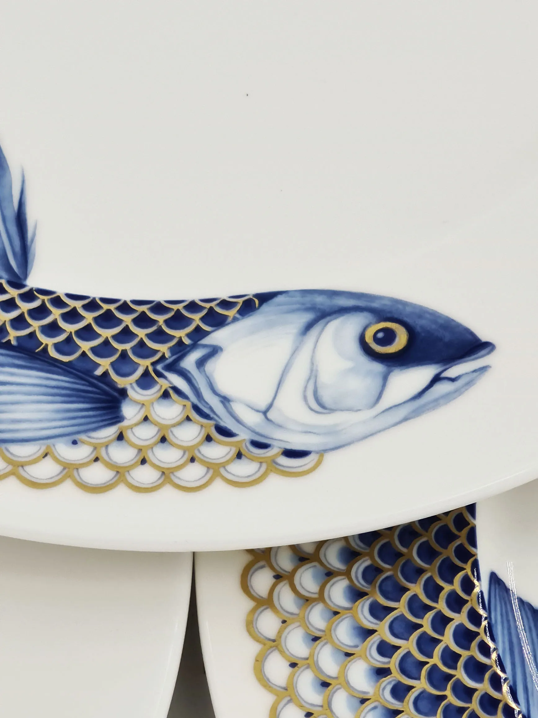 Porcelaine blanche , marli à décor de poisson en camaïeu de bleu et or.