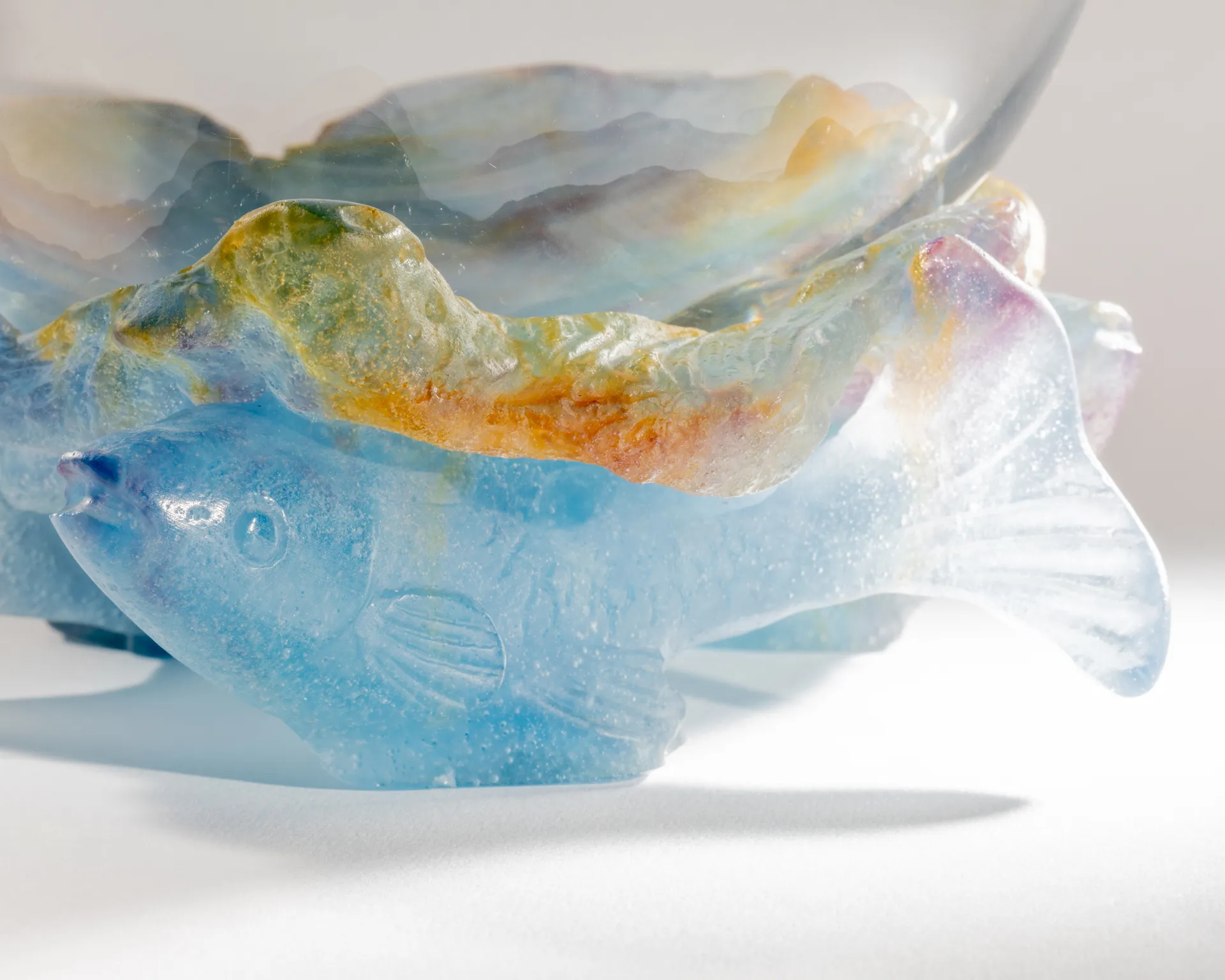 La partie supérieure amovible est en cristal clair et le socle est en pâte de verre représentant trois poissons de couleur mauve, bleu et ambré.