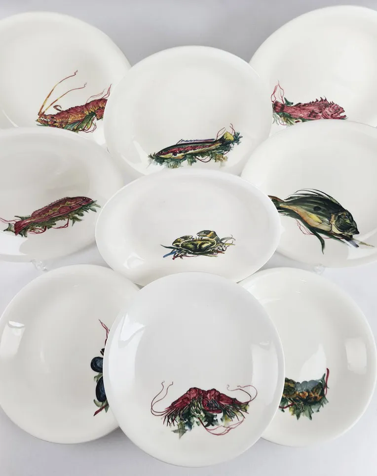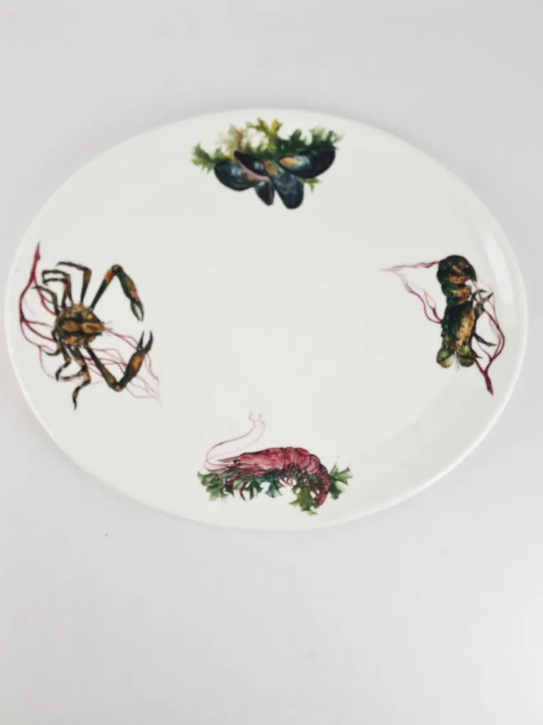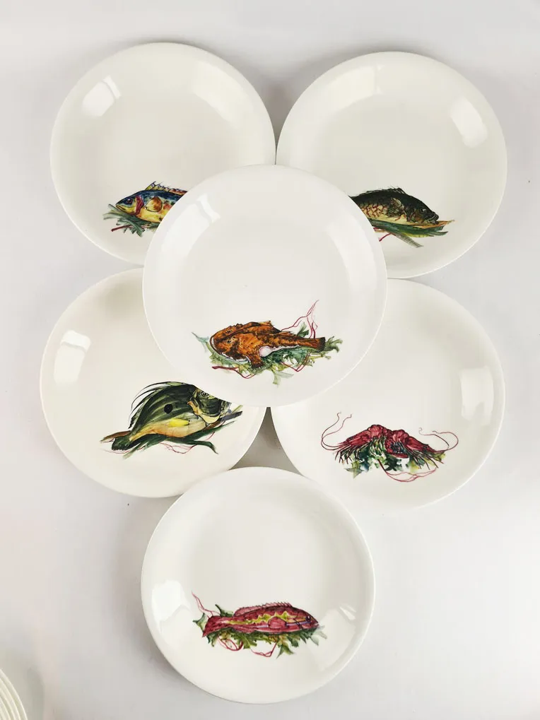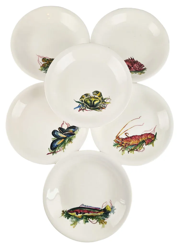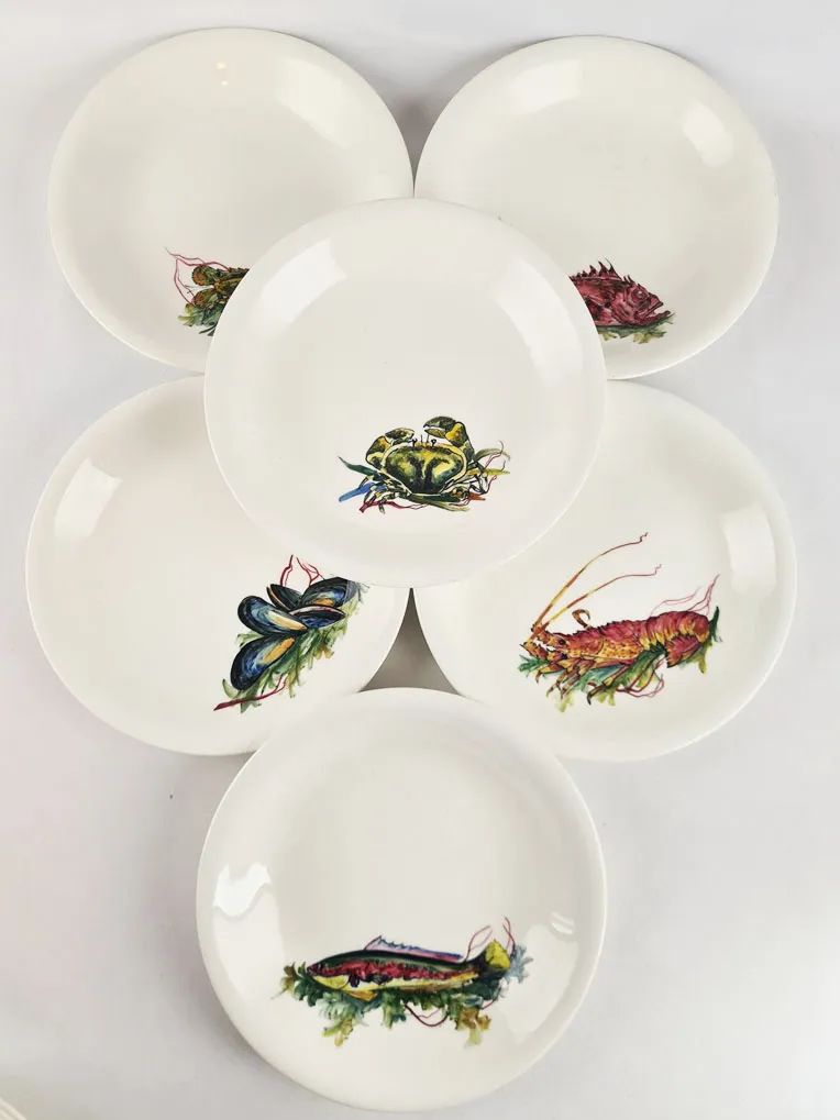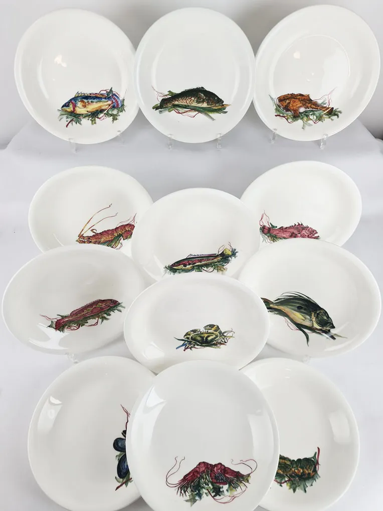 Ensemble peint à la main en 1962 représentant sur une base de faïence ivoire des poissons et des crustacés aux couleurs vives et peints au naturel.
