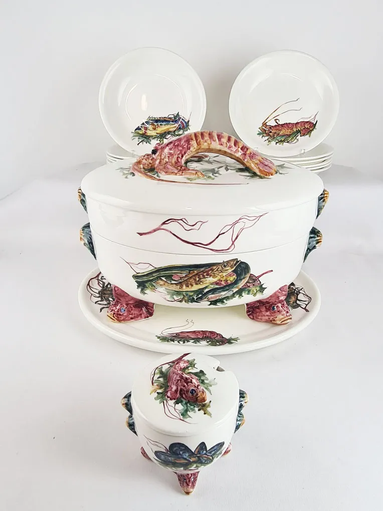 La soupière est très spectaculaire, reposant sur 4 pieds à décor de poisson, les prises en forme de coquillages et la prise du couvercle figurant une langouste.