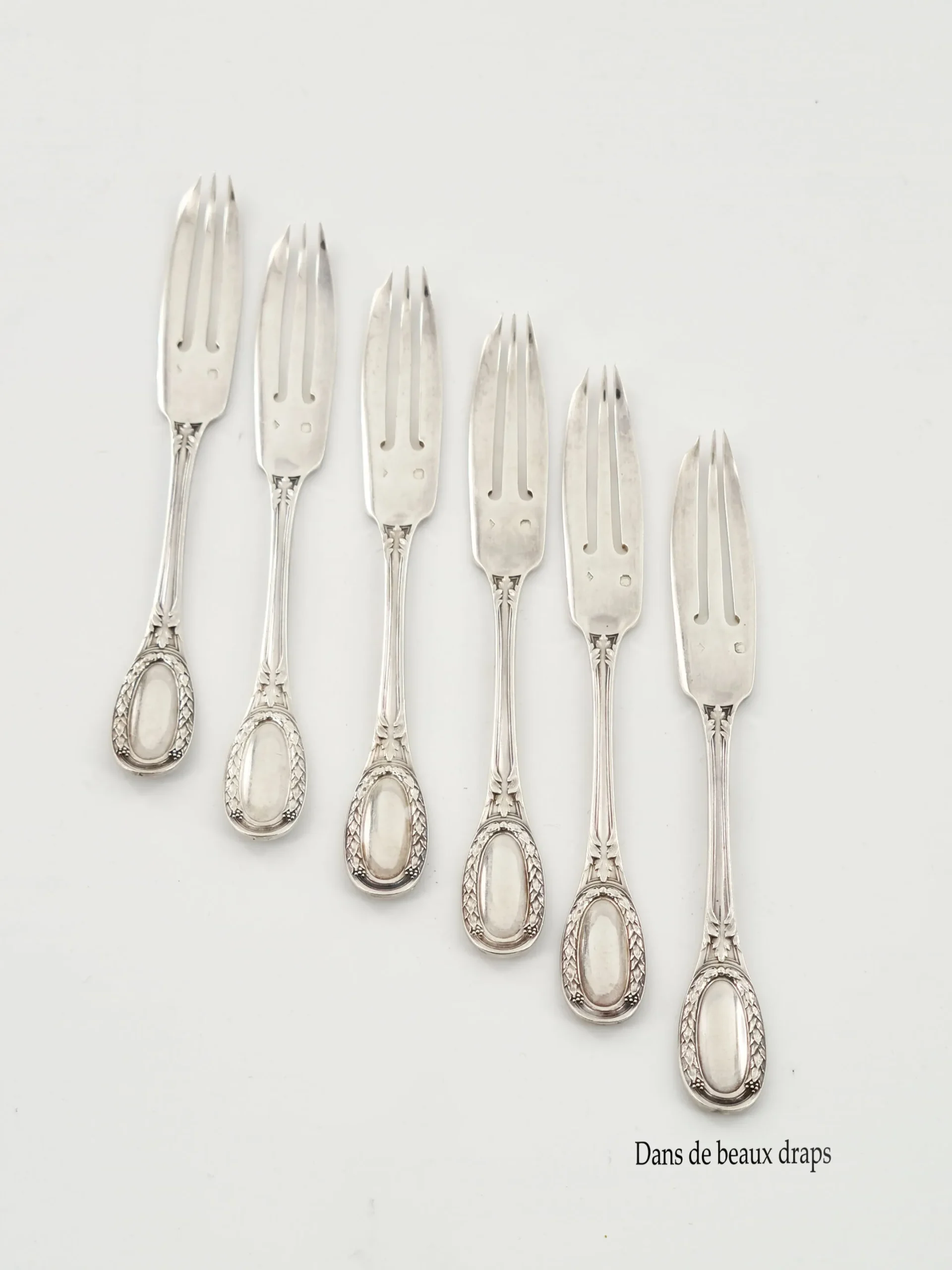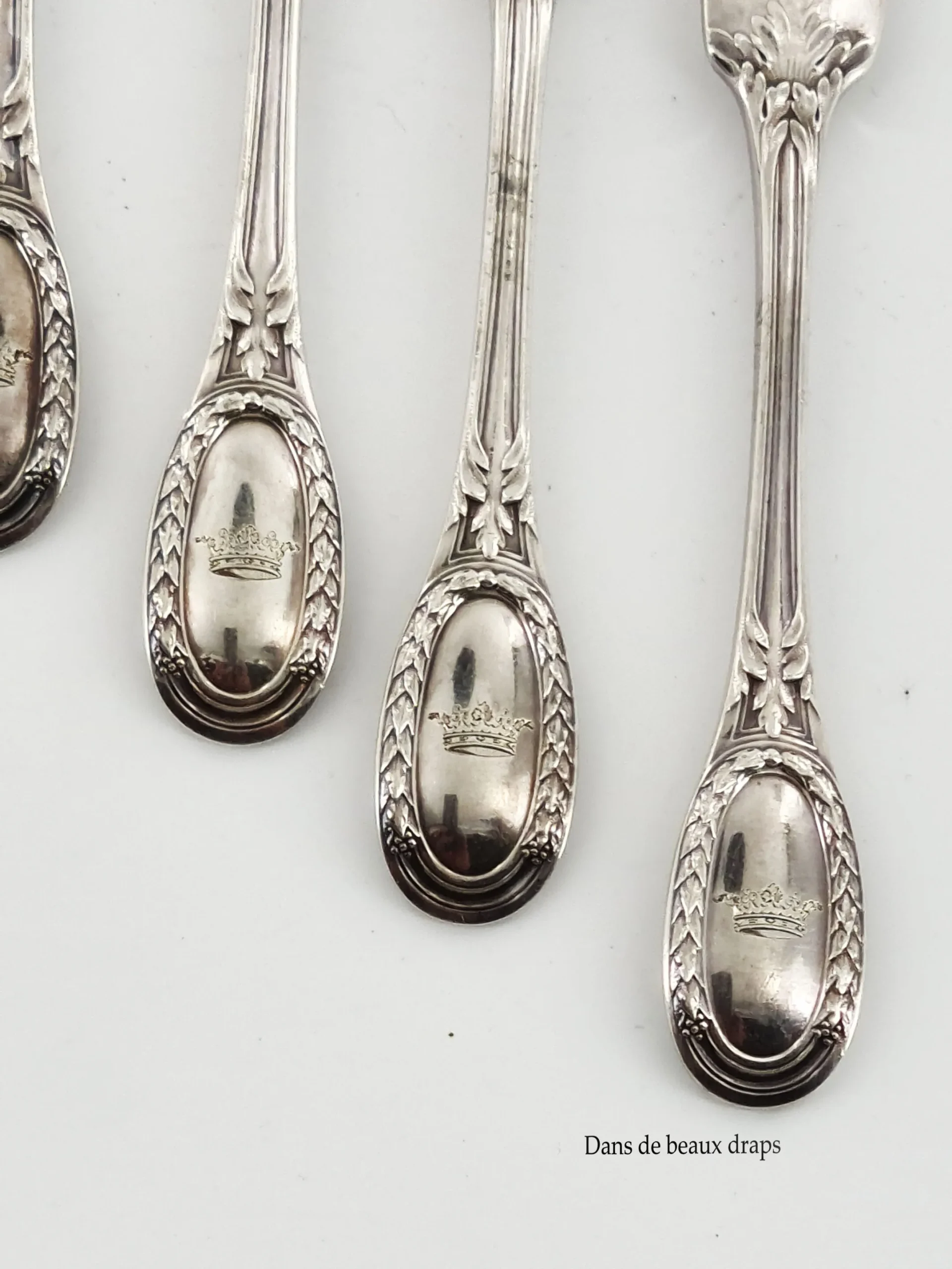 Superbe suite de 6 fourchettes à gâteaux en argent, couronne ducale.