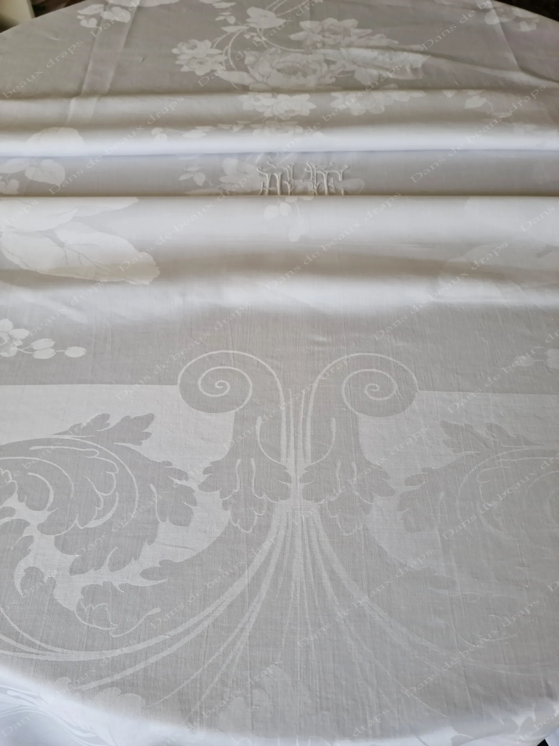 Très belle nappe de buffet carrée en damassé de lin,époque Napoléon III,monogramme AHE.