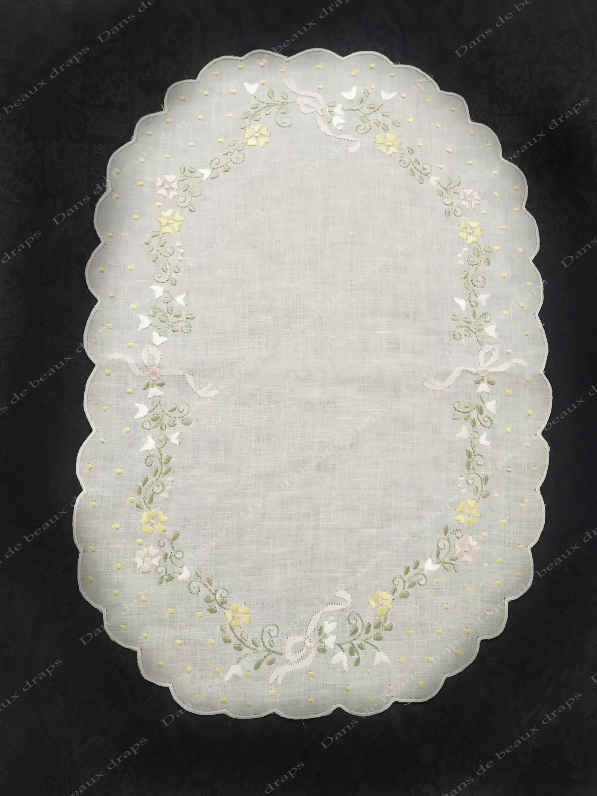 De forme ovale,bords festonnés,décor de pois et de fleurs sur le tour.