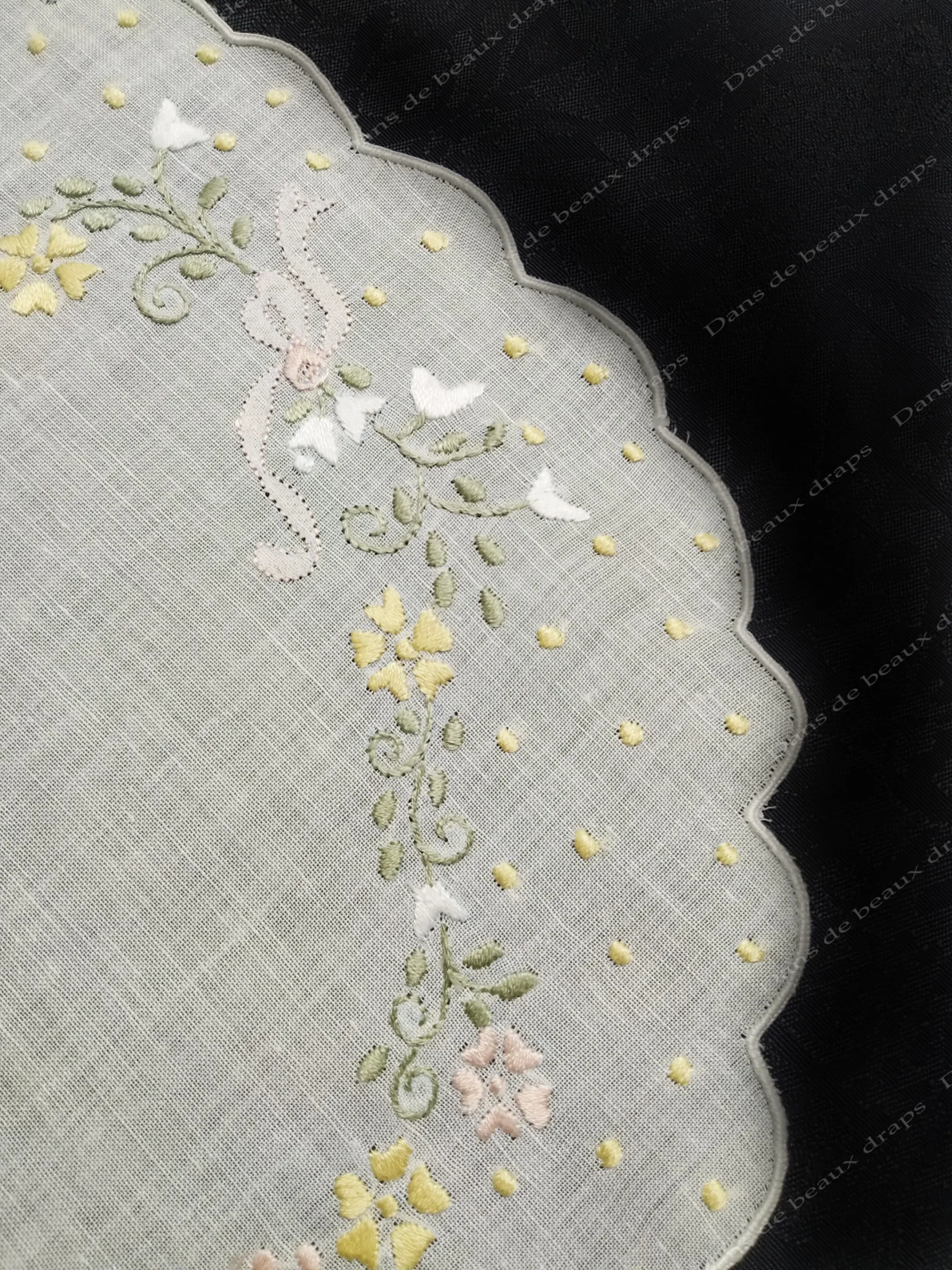 Broderies main dans les tons de jaune,rose pale,vert pale et blanc.